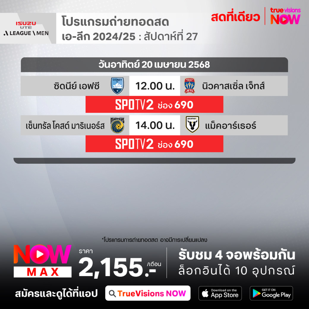Central Coast Mariners vs Macarther เวลา 14.00-16.00 ทางช่อง SPOTV2 (690)