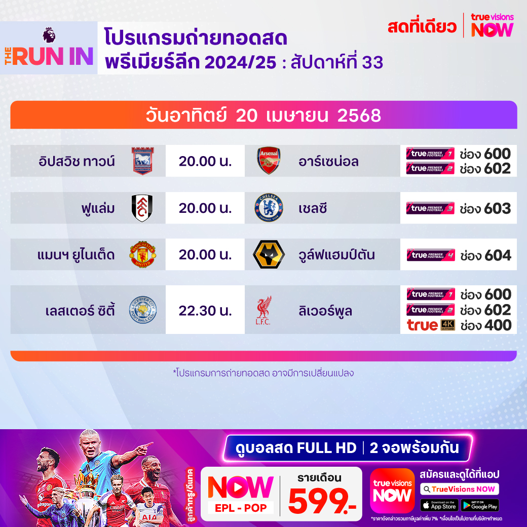 วันนี้มีอะไรดูที่ ทรูวิชั่นส์ ประจำวันอาทิตย์ที่ 20 เมษายน 68 ยังคงมีกีฬาที่น่าสนใจให้ได้ตามลุ้นตามเชียร์กันเหมือนเดิม โดยในส่วนของฟุตบอลนั้นยังมีศึกพรีเมียร์ลีก อังกฤษ, บุนเดสลีกา เยอรมนี, ลา ลีกา สเปน, เอ-ลีก ออสเตรเลีย และ ไทยลีก 1, 2 ให้ได้ตามเชียร์กันต่อ ส่วนกีฬาอื่นๆ คอมอเตอร์สปอร์ตพลาดไม่ได้กับศึก ฟอร์มูล่า วัน สนามที่ 5 รายการ ซาอุดิอาระเบียน กรังด์ปรีซ์ นอกจากนี้ยังมีเทนนิส เอทีพี ทัวร์ รายการ บาร์เซโลน่า โอเพ่น, ดับเบิ้ลยูทีเอ ทัวร์ รายการ สตุ๊ตการ์ท โอเพ่น, กอล์ฟ พีจีเอ ทัวร์ รายการ อาร์บีซี เฮอร์ริเทจ, ดีพี เวิลด์ ทัวร์ รายการ วอลโว่ ไชน่า โอเพ่น และ แอลพีจีเอ ทัวร์ รายการ เจเอ็ม แอลเอ แชมเปี้ยนชิพ, เวิลด์ สนุกเกอร์ ทัวร์ รายการ เวิลด์ แชมเปี้ยนชิพ, วอลเลย์บอล เอสวี ลีก และ บาสเกตบอลเอ็นบีเอ งานนี้ ทรูวิชั่นส์ จัดเต็มให้ชมกันถึงบ้าน