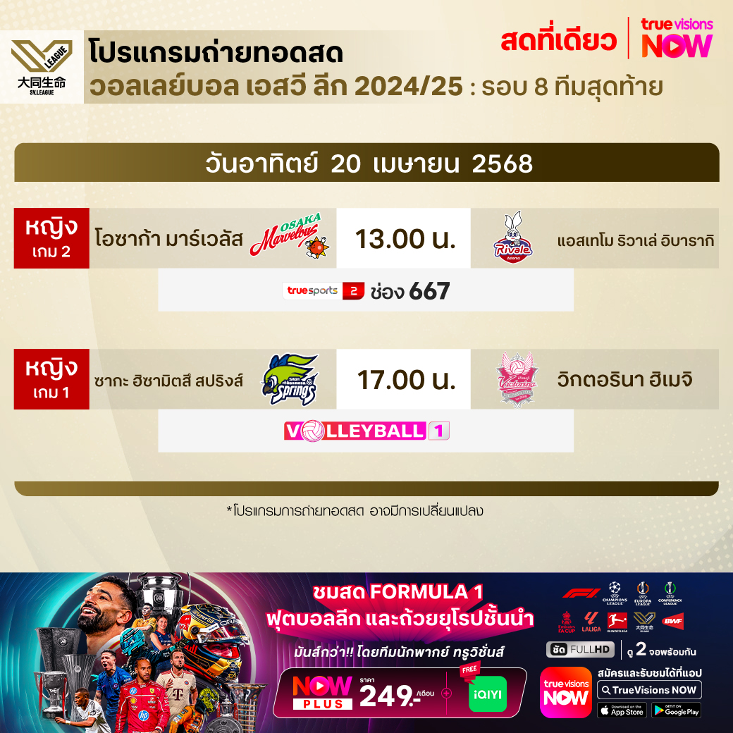 ซากะ ฮิซามิตสึ สปริงส์ พบ วิกตอรินา ฮิเมจิ เวลา 17.00 - 19.30 ทางช่อง Volleyball 1