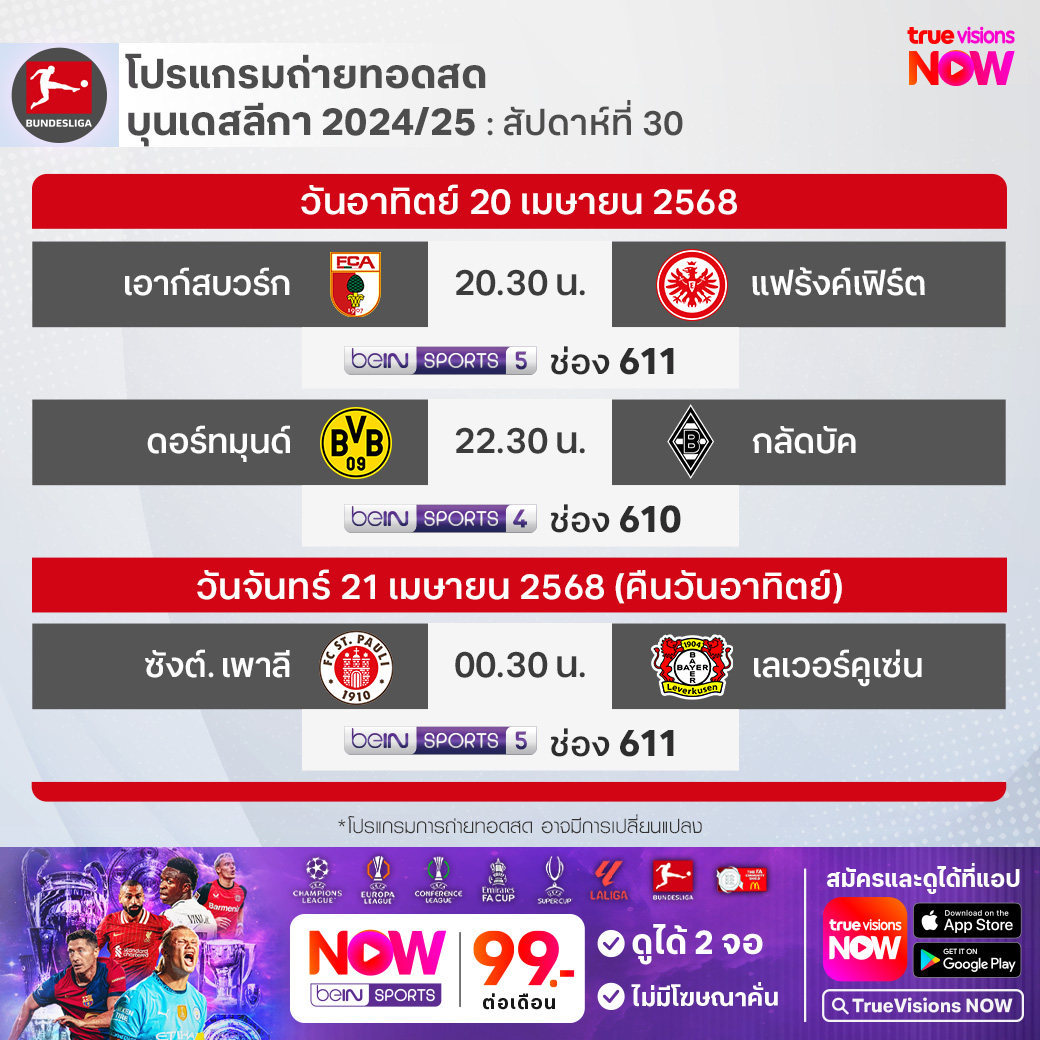 St. Pauli vs Leverkusen เวลา 00.30-02.30 ทางช่อง beIN 5 (611)