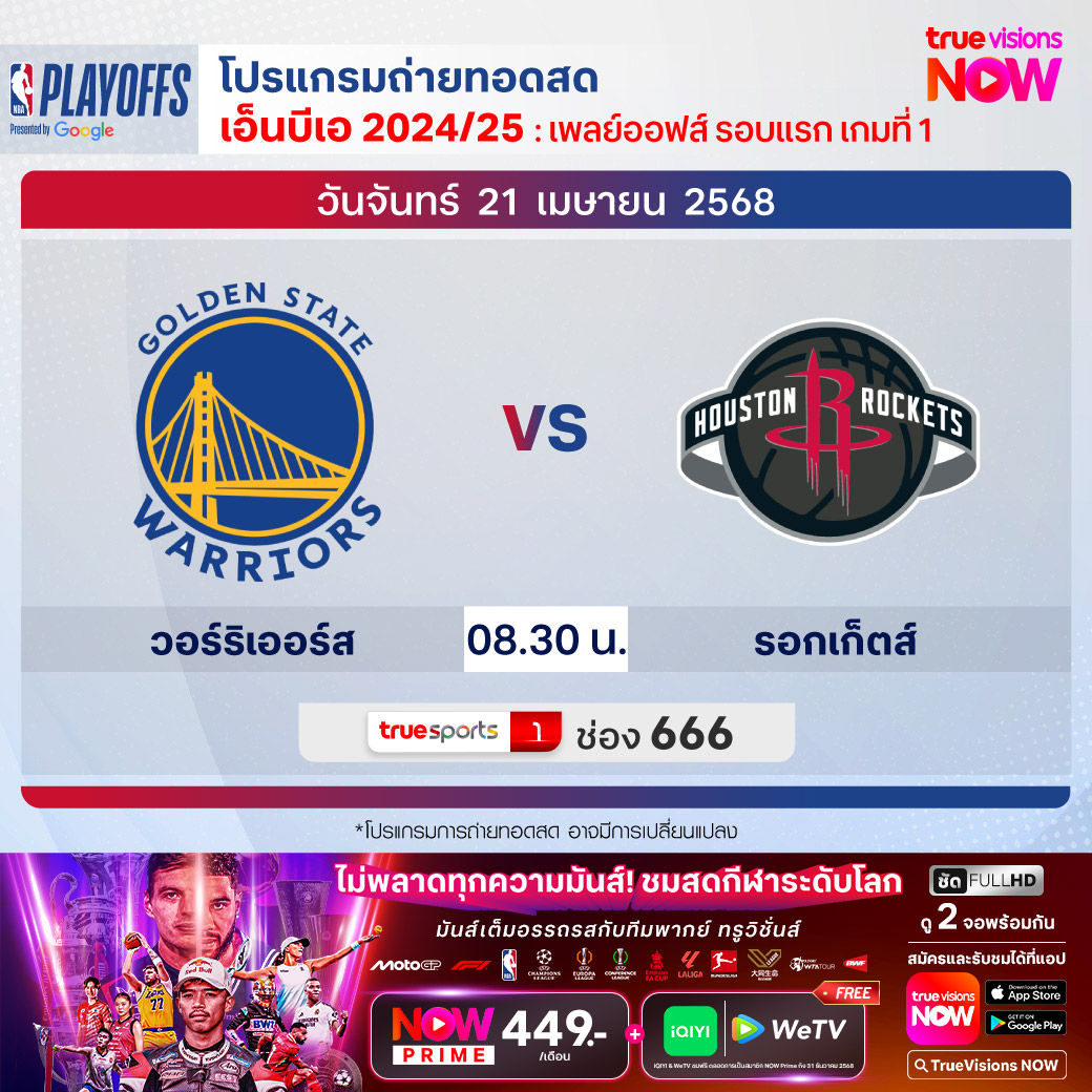 วันจันทร์ 21 เม.ย. Warriors Vs Rockets เวลา 08.30 ทางช่อง TS 1 (666)