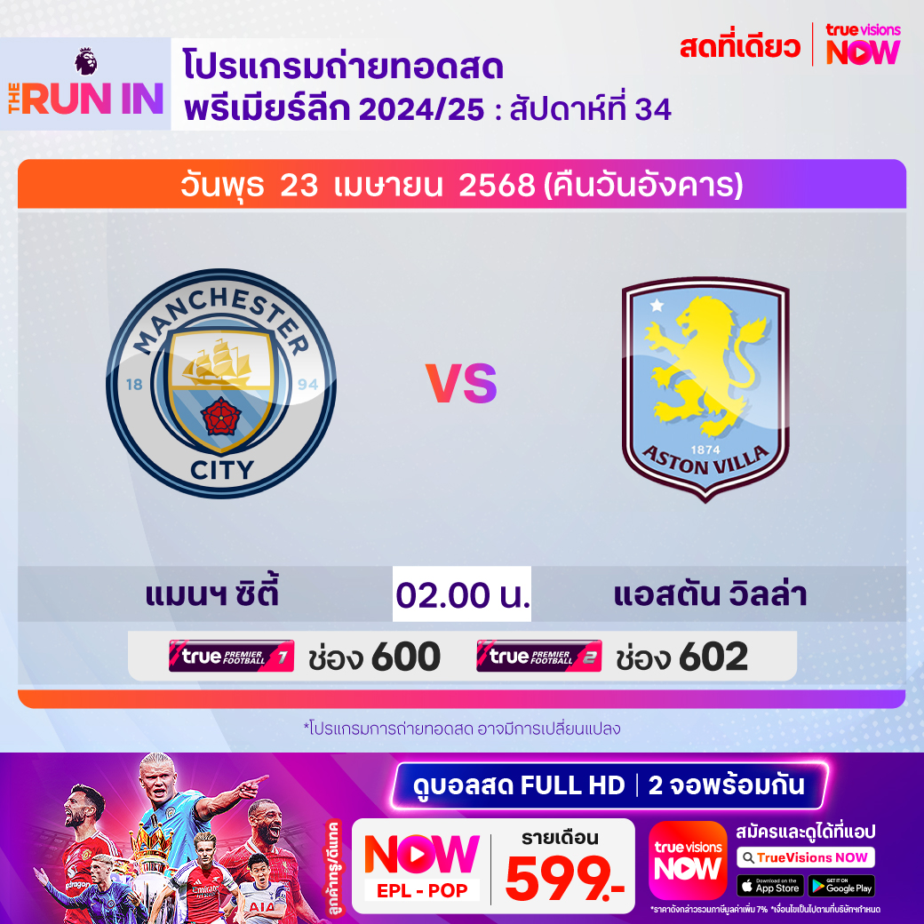 Man City vs Aston Villa เวลา 02:00 - 04:00 ทางช่อง TPF 1 (600) / TPF 2 (602)
