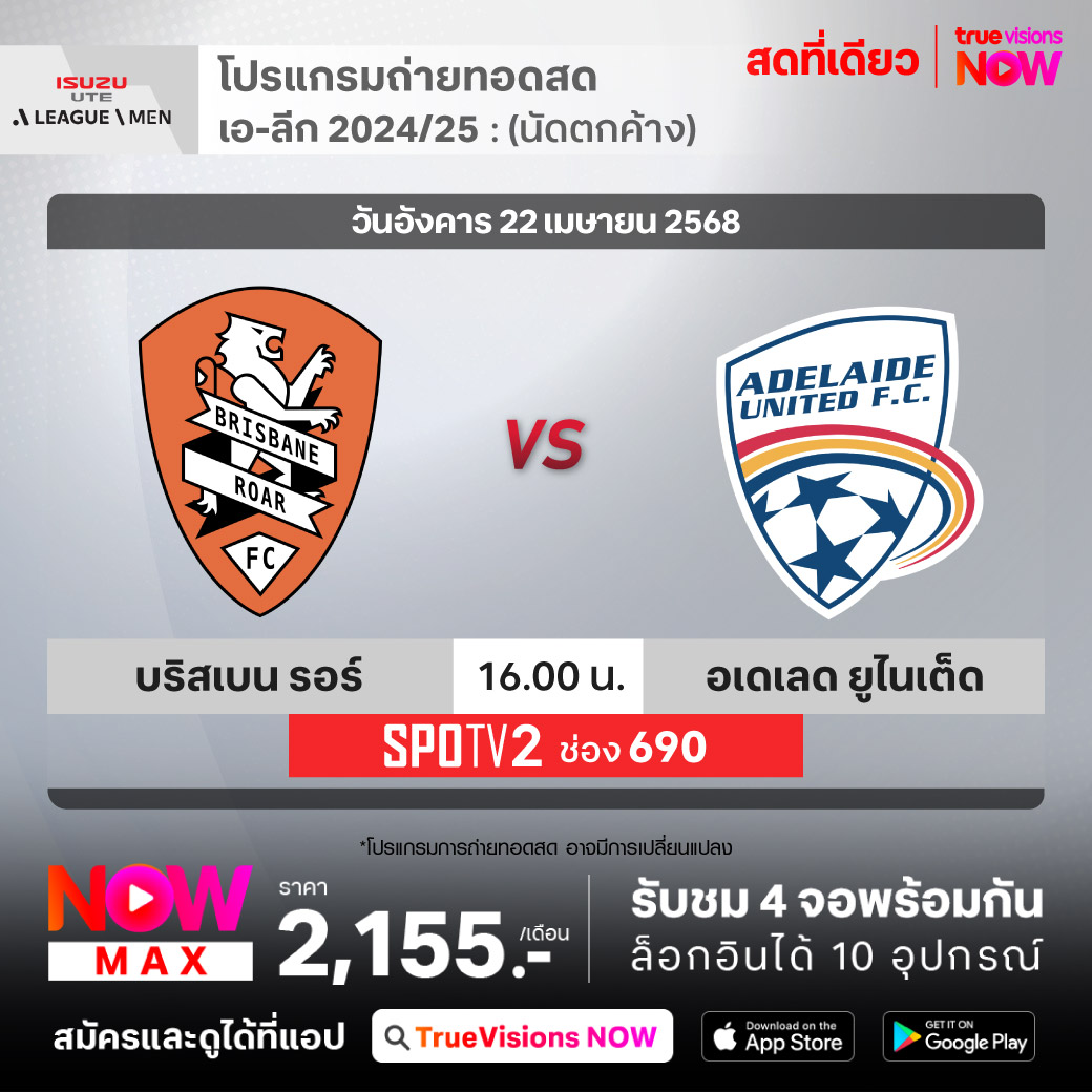 Brisbane Roar vs Adelaide United เวลา 16.00-18.00 ทางช่อง SPOTV2 (690)
