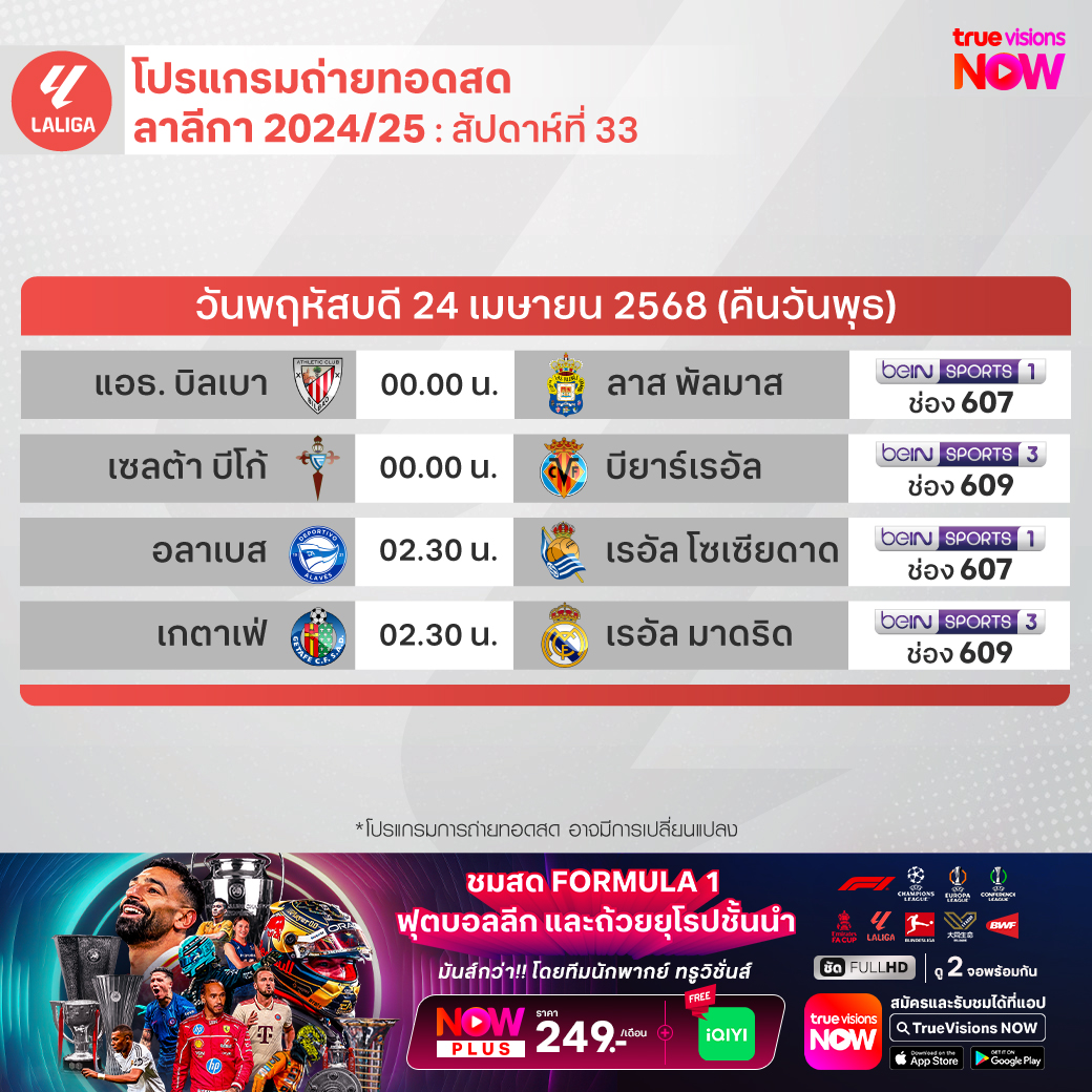 Athletic Bilbao vs Las Palmas เวลา 00.00-02.00 ทางช่อง beIN 1 (607)