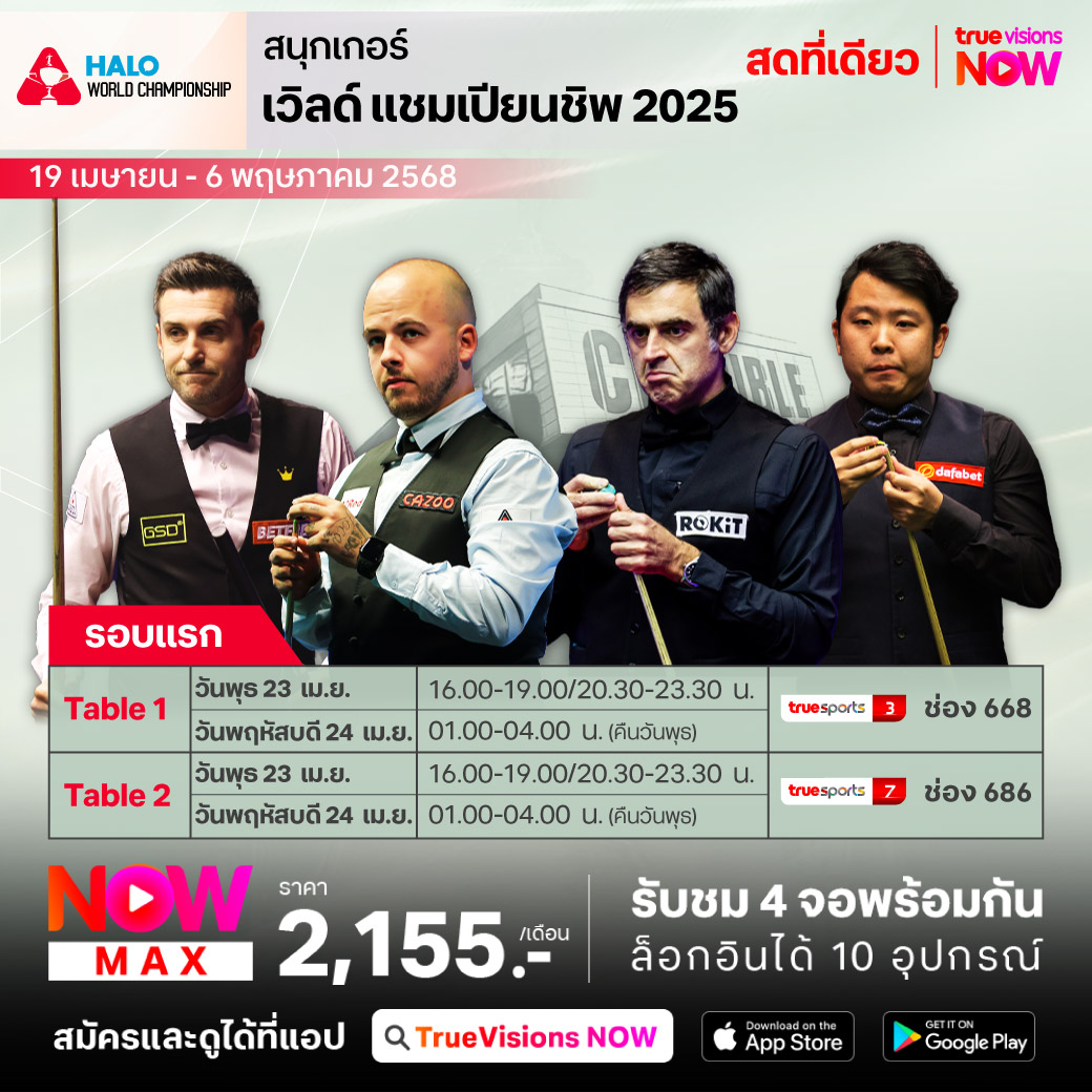 ไม่ต้องรออีกต่อไป เมื่อความยิ่งใหญ่ที่แฟนๆ รอคอยมาถึงแล้ว กับศึก เวิลด์ สนุกเกอร์ ทัวร์ รายกาย เวิลด์ แชมเปี้ยนชิพ หรือสนุกเกอร์ชิงแชมป์โลก รายการที่เก่าแก่และและยิ่งใหญ่ที่สุด เปิดฉากขึ้นแล้วที่สังเวียน ครูซิเบิ้ล เธียเตอร์ อันศักดิ์สิทธิ์ ในเมืองเชฟฟิลด์ ประเทศอังกฤษ ชมเกมสดๆ การันตีครบทุกแมตช์ตลอด 17 วันเต็ม ร่วมลุ้นกันว่าใครจะก้าวขึ้นสู่บัลลังก์แชมป์โลกอันทรงเกียรติในปีนี้ ชมสด เอ็กซ์คลูซีฟ ที่เดียวที่ ทรูวิชั่นส์