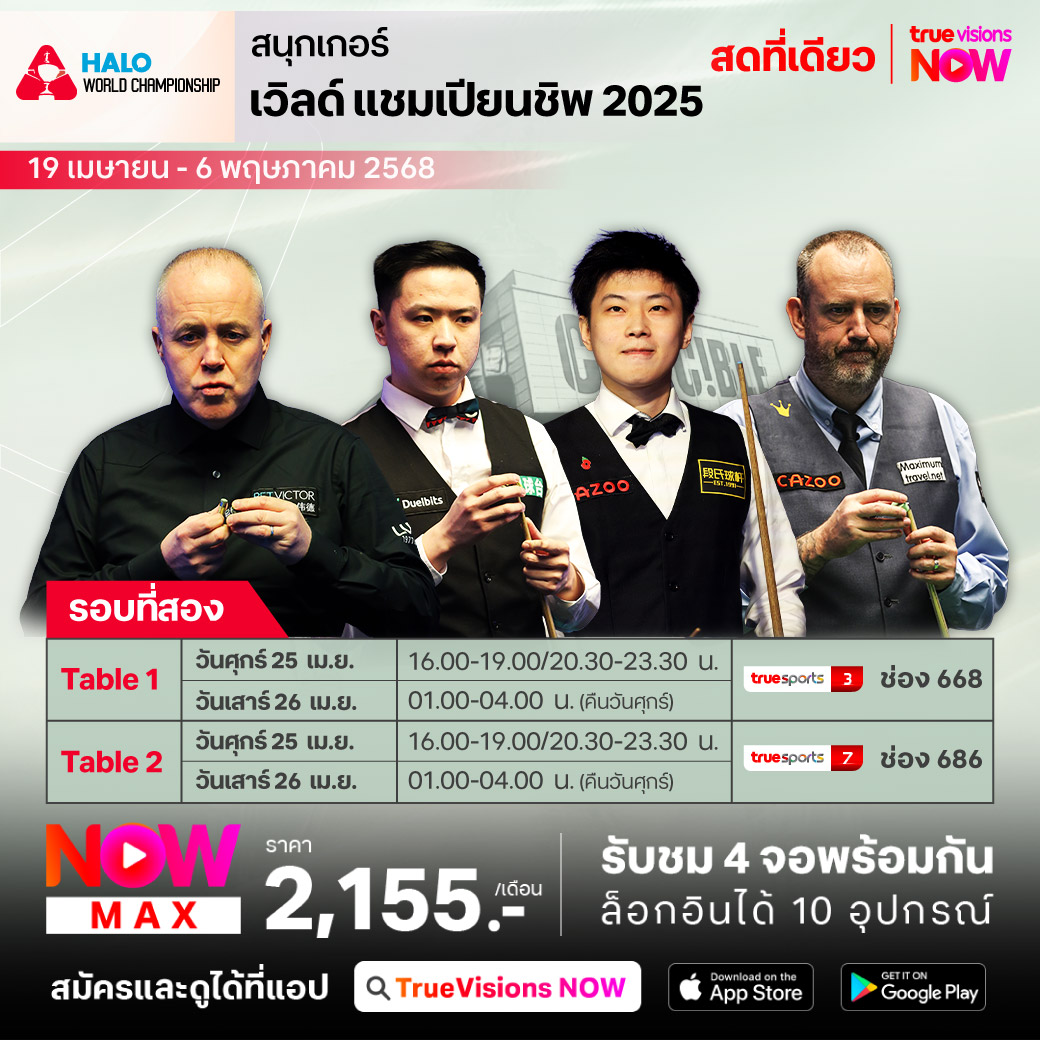ไม่ต้องรออีกต่อไป เมื่อความยิ่งใหญ่ที่แฟนๆ รอคอยมาถึงแล้ว กับศึก เวิลด์ สนุกเกอร์ ทัวร์ รายกาย เวิลด์ แชมเปี้ยนชิพ หรือสนุกเกอร์ชิงแชมป์โลก รายการที่เก่าแก่และและยิ่งใหญ่ที่สุด เปิดฉากขึ้นแล้วที่สังเวียน ครูซิเบิ้ล เธียเตอร์ อันศักดิ์สิทธิ์ ในเมืองเชฟฟิลด์ ประเทศอังกฤษ ชมเกมสดๆ การันตีครบทุกแมตช์ตลอด 17 วันเต็ม ร่วมลุ้นกันว่าใครจะก้าวขึ้นสู่บัลลังก์แชมป์โลกอันทรงเกียรติในปีนี้ ชมสด เอ็กซ์คลูซีฟ ที่เดียวที่ ทรูวิชั่นส์