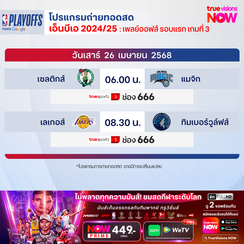 วันเสาร์ 26 เม.ย. Lakers Vs Timberwolves เวลา 08.30 ทางช่อง TS 1 (666)