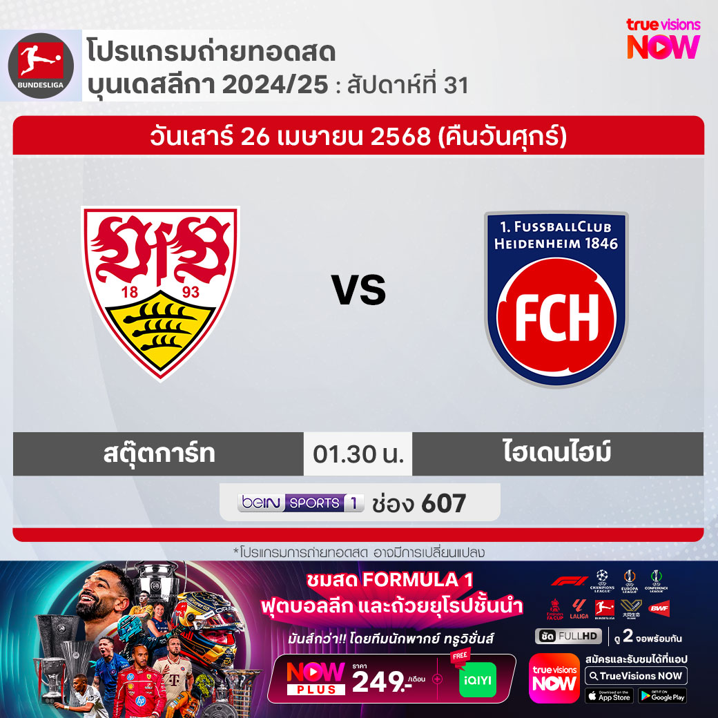 Stuttgart vs Heidenheim เวลา 01.30-03.30 ทางช่อง beIN 1 (607)