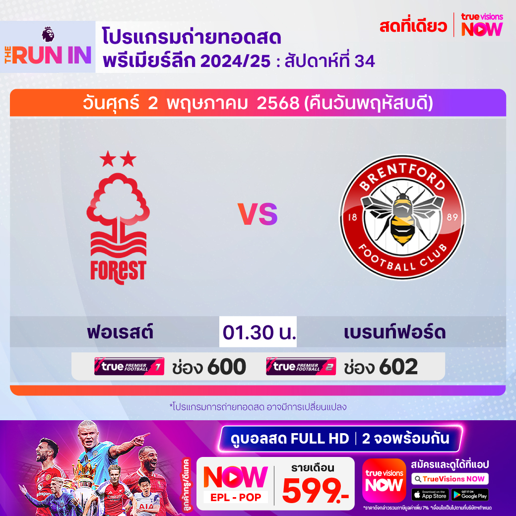 Nottingham Forest vs Brentford เวลา 01:30 - 03:30 ทางช่อง TPF 1 (600) / TPF 2 (602)