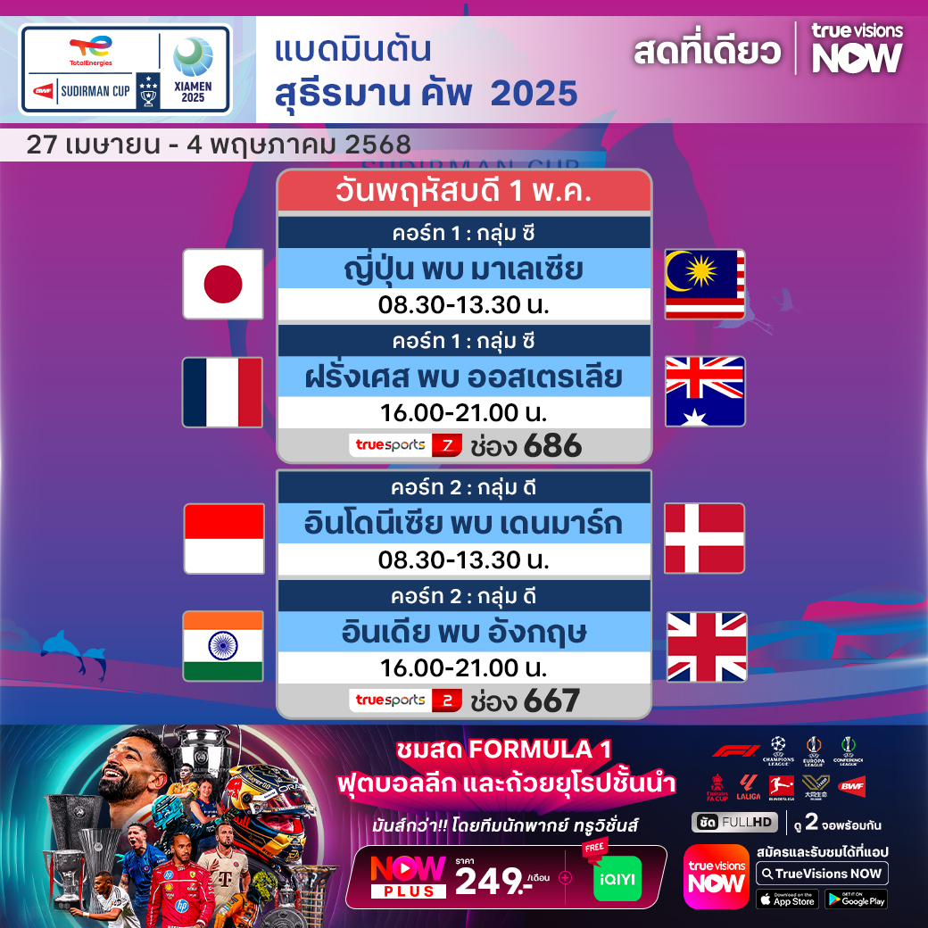 แบดมินตันทีมผสมชิงแชมป์โลก หรือ สุธีรมาน คัพ 2025 ที่แฟนๆ รอคอยกันมานานถึง 2 ปีเต็ม กับทัวร์นาเมนต์แห่งศักดิ์ศรี และความภาคภูมิใจของนักกีฬาในการเป็นตัวแทนของชาติ ทุ่มเทเพื่อทีม เพื่อชัยชนะ และประกาศความเก่งกาจเชิงแบดมินตันของทีมชาติไทย ใส่แบบไม่ยั้งกับคู่แข่งระดับโลก ติดตามแบบจุใจ ตั้งแต่รอบแบ่งกลุ่มจนถึงรอบชิงชนะเลิศ ชมสด เอ็กซ์คลูซีฟ ที่เดียวที่ ทรูวิชั่นส์