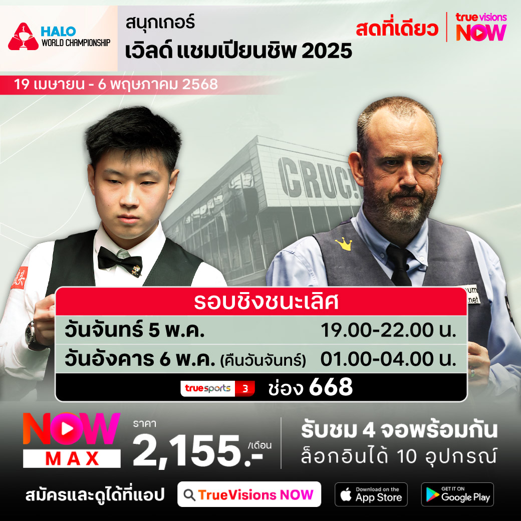 ไม่ต้องรออีกต่อไป เมื่อความยิ่งใหญ่ที่แฟนๆ รอคอยมาถึงแล้ว กับศึก เวิลด์ สนุกเกอร์ ทัวร์ รายกาย เวิลด์ แชมเปี้ยนชิพ หรือสนุกเกอร์ชิงแชมป์โลก รายการที่เก่าแก่และและยิ่งใหญ่ที่สุด เปิดฉากขึ้นแล้วที่สังเวียน ครูซิเบิ้ล เธียเตอร์ อันศักดิ์สิทธิ์ ในเมืองเชฟฟิลด์ ประเทศอังกฤษ ชมเกมสดๆ การันตีครบทุกแมตช์ตลอด 17 วันเต็ม ร่วมลุ้นกันว่าใครจะก้าวขึ้นสู่บัลลังก์แชมป์โลกอันทรงเกียรติในปีนี้ ชมสด เอ็กซ์คลูซีฟ ที่เดียวที่ ทรูวิชั่นส์