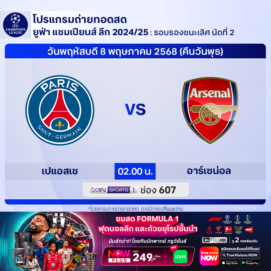 PSG vs Arsenal เวลา 02.00-04.00 ทางช่อง beIN 1 (607)
