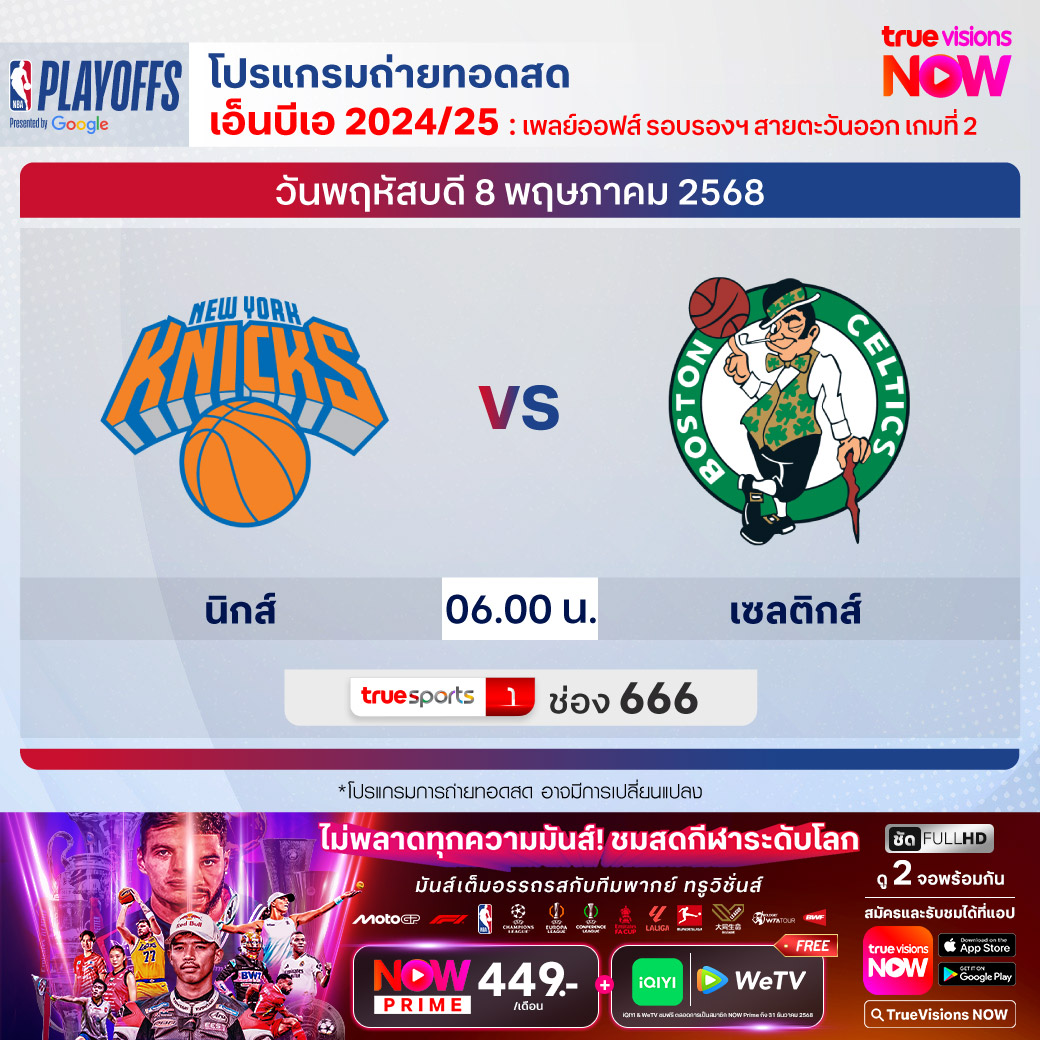 วันพฤหัสบดี 8 พ.ค. Knicks Vs Celtics เวลา 06.00 ทางช่อง TS 1 (666)