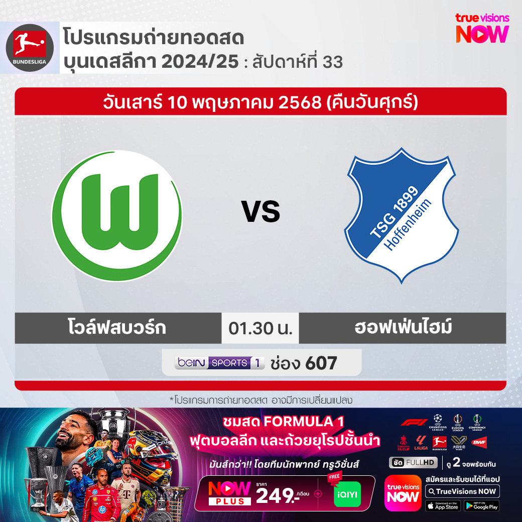 Wolfsburg vs Hoffenheim เวลา 01.30-03.30 ทางช่อง beIN 1 (607)