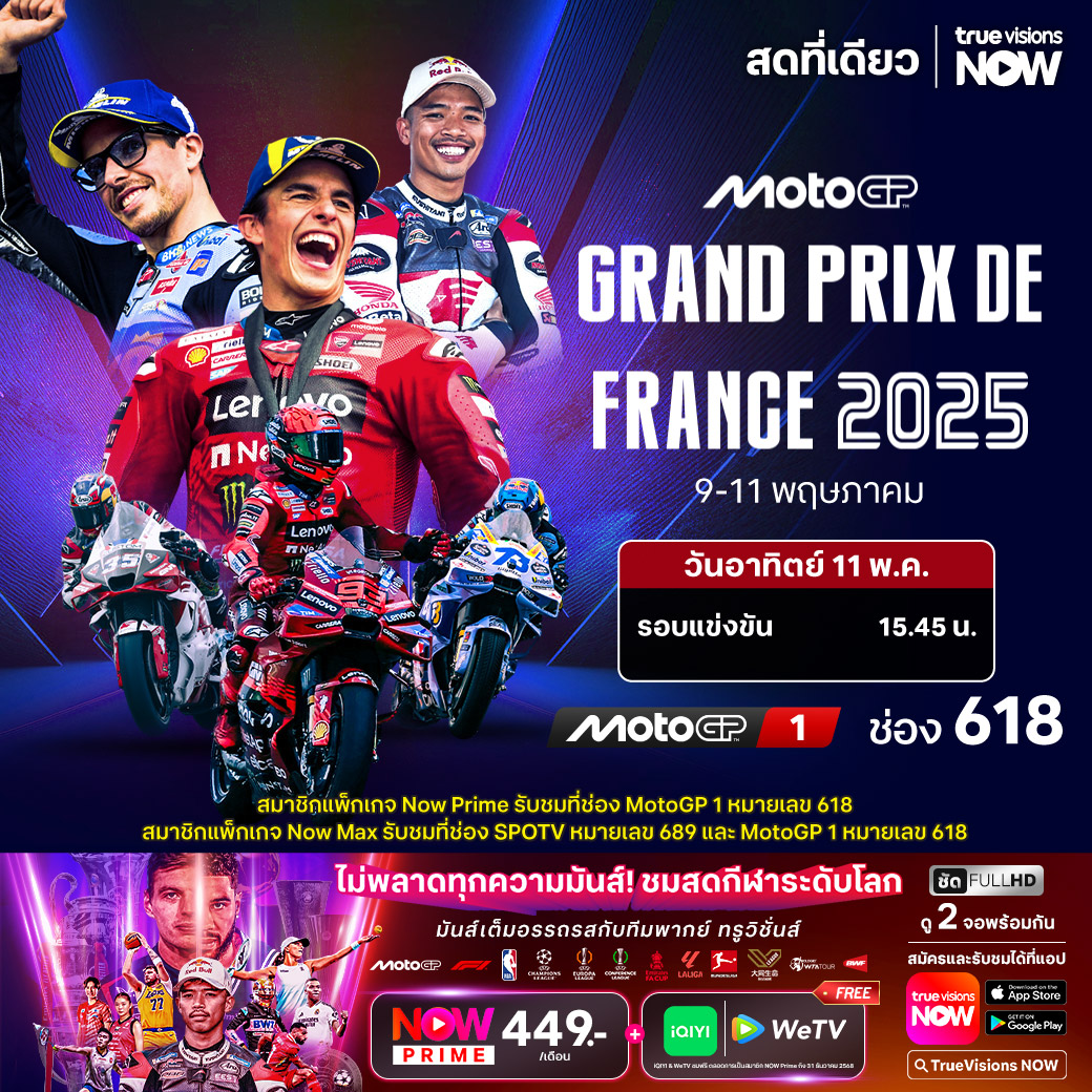 โมโต จีพี เวิลด์ แชมเปี้ยนชิพ ฤดูกาล 2025 สัปดาห์นี้ เป็นการดวลความเร็วระดับโลกที่แดนน้ำหอม ประเทศฝรั่งเศส กับรายการ กรังด์ปรีซ์ ออฟ ฟร้านซ์ เรซที่ 6 ของปี ที่สนาม เลอ มังส์ เซอร์กิต การันตีความดุเดือด เร้าใจ ทั้ง 3 รุ่น จับตาดูรุ่นพรีเมียร์คลาส โมโต จีพี ใครจะคว้าโพเดียมไปครอง ชมสด เอ็กซ์คลูซีฟ ที่เดียวที่ ทรูวิชั่นส์