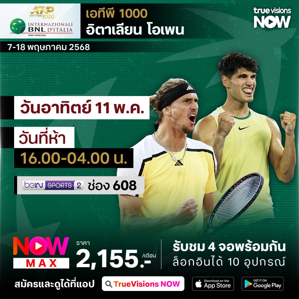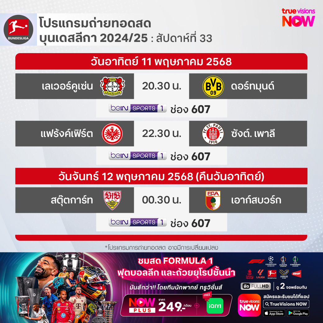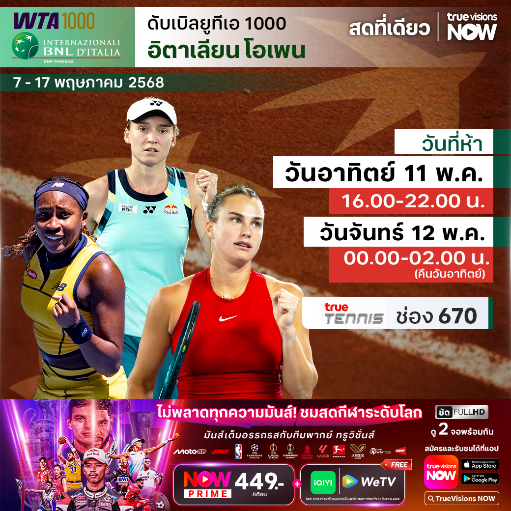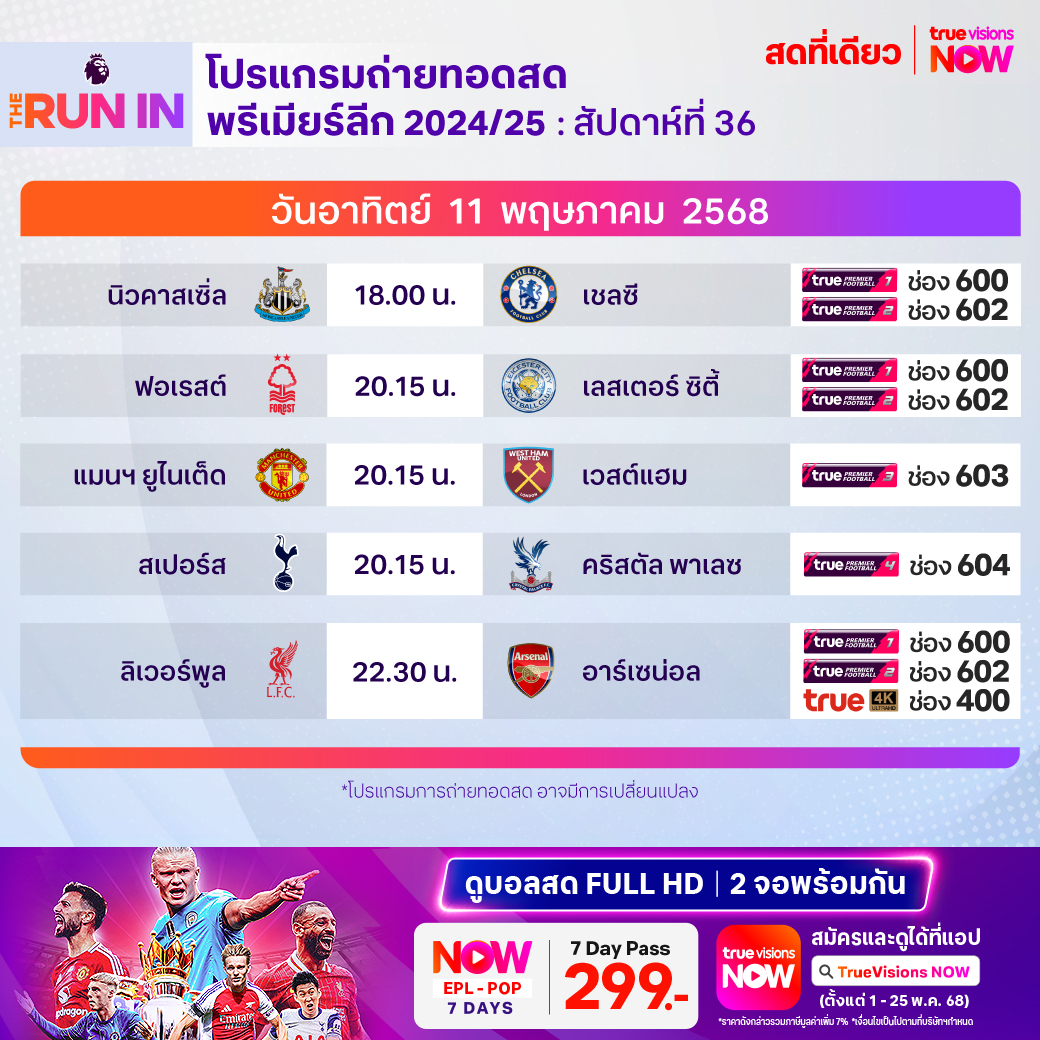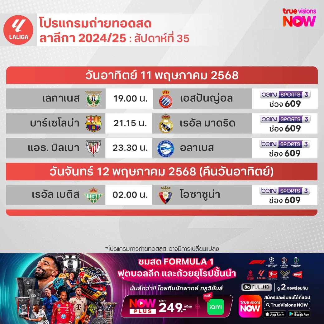 วันนี้มีอะไรดูที่ ทรูวิชั่นส์ ประจำวันอาทิตย์ที่ 11 พฤษภาคม 68 ยังคงมีกีฬาที่น่าสนใจให้ได้ตามลุ้นตามเชียร์กันเหมือนเดิม โดยในส่วนของฟุตบอลนั้นยังมีศึกพรีเมียร์ลีก อังกฤษ, บุนเดสลีกา เยอรมนี, ลา ลีกา สเปน, เมเจอร์ลีก ซอคเก้อร์, ซาอุดิ โปร ลีก, ไทยลีก 2 และ ฟุตซอลไทยลีก ให้ได้ตามเชียร์กันต่อ ส่วนกีฬาอื่นๆ ยังมีศึกโมโต จีพี รายการ กรังด์ปรีซ์ ออฟ ฟร้านซ์, เทนนิส เอทีพี ทัวร์ และ ดับเบิ้ลยูทีเอ ทัวร์ รายการ อิตาเลียน โอเพ่น, กอล์ฟ พีจีเอ ทัวร์ รายการ ทรูอิสต์ แชมเปี้ยนชิพ, ดีพี เวิลด์ ทัวร์ รายการ เตอร์กิช แอร์ไลน์ โอเพ่น, แอลพีจีเอ ทัวร์ รายการ มิซูโฮ อเมริกาส์ โอเพ่น, แบดมินตัน บีดับเบิ้ลยูเอฟ รายการ ไทเป โอเพ่น และ บาสเกตบอลเอ็นบีเอ เพลย์ออฟ งานนี้ ทรูวิชั่นส์ จัดเต็มให้ชมกันถึงบ้าน