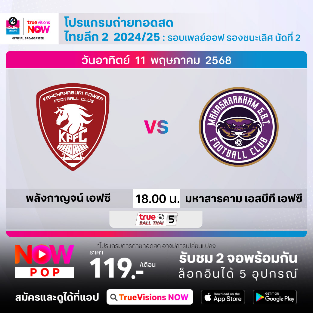 พลังกาญจน์ เอฟซี พบ มหาสารคาม เอสบีที เอฟซี เวลา 18.00-20.00 ทางช่อง True Ball Thai 5