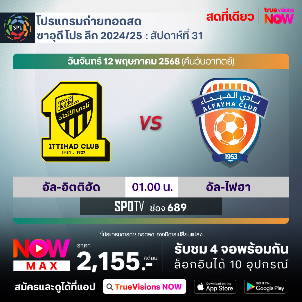 Al-Ittihad vs Al-Fayha เวลา 01.00-03.00 ทางช่อง SPOTV (689)