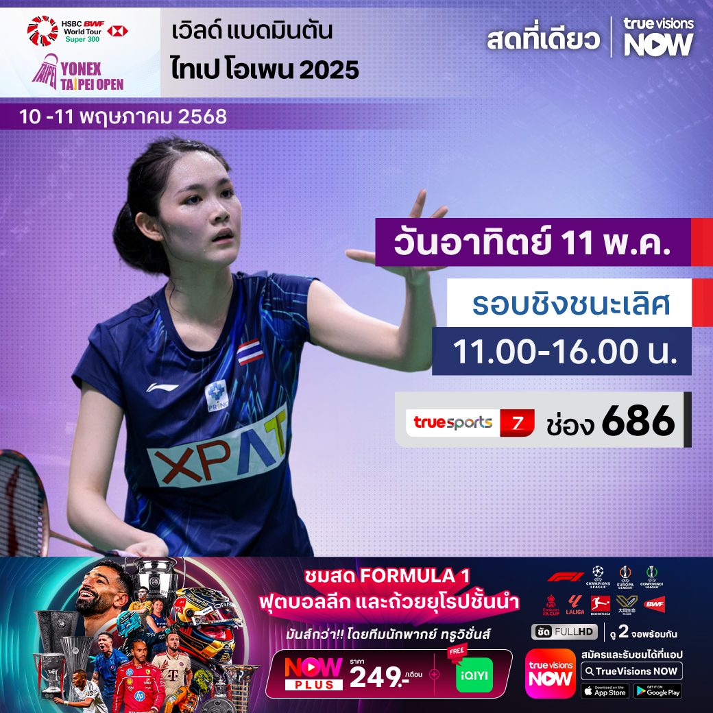 แฟนๆ แบดมินตัน มันส์กันต่อกับรายการเก็บคะแนนสะสมโลก สัปดาห์นี้พบกับรายการ ไทเป โอเพ่น 2025 ร่วมเชียร์ "น้องพิ้งค์" พิชฌามลณ์ โอภาสนิพัทธ์ ในรอบชิงชนะเลิศประเภทหญิงเดี่ยว ให้คว้าแชมป์มาครองให้ได้ ชมสด เอ็กซ์คลูซีฟ ที่เดียวที่ ทรูวิชั่นส์