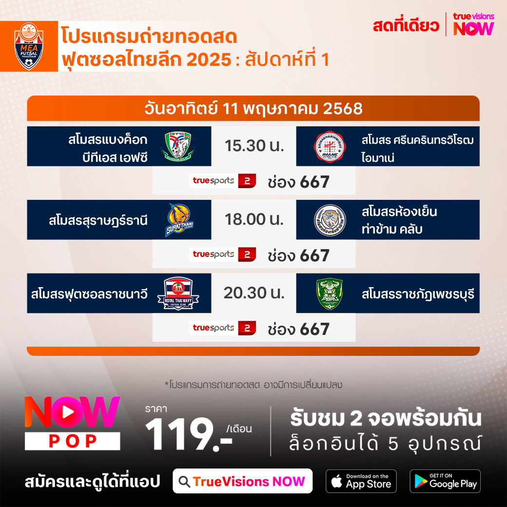 สโมสรแบงค็อก บีทีเอส เอฟซี พบ สโมสร ศรีนครินทรวิโรฒ ไอมาเน่ เวลา 15:30 ทางช่อง TS 2 (667)