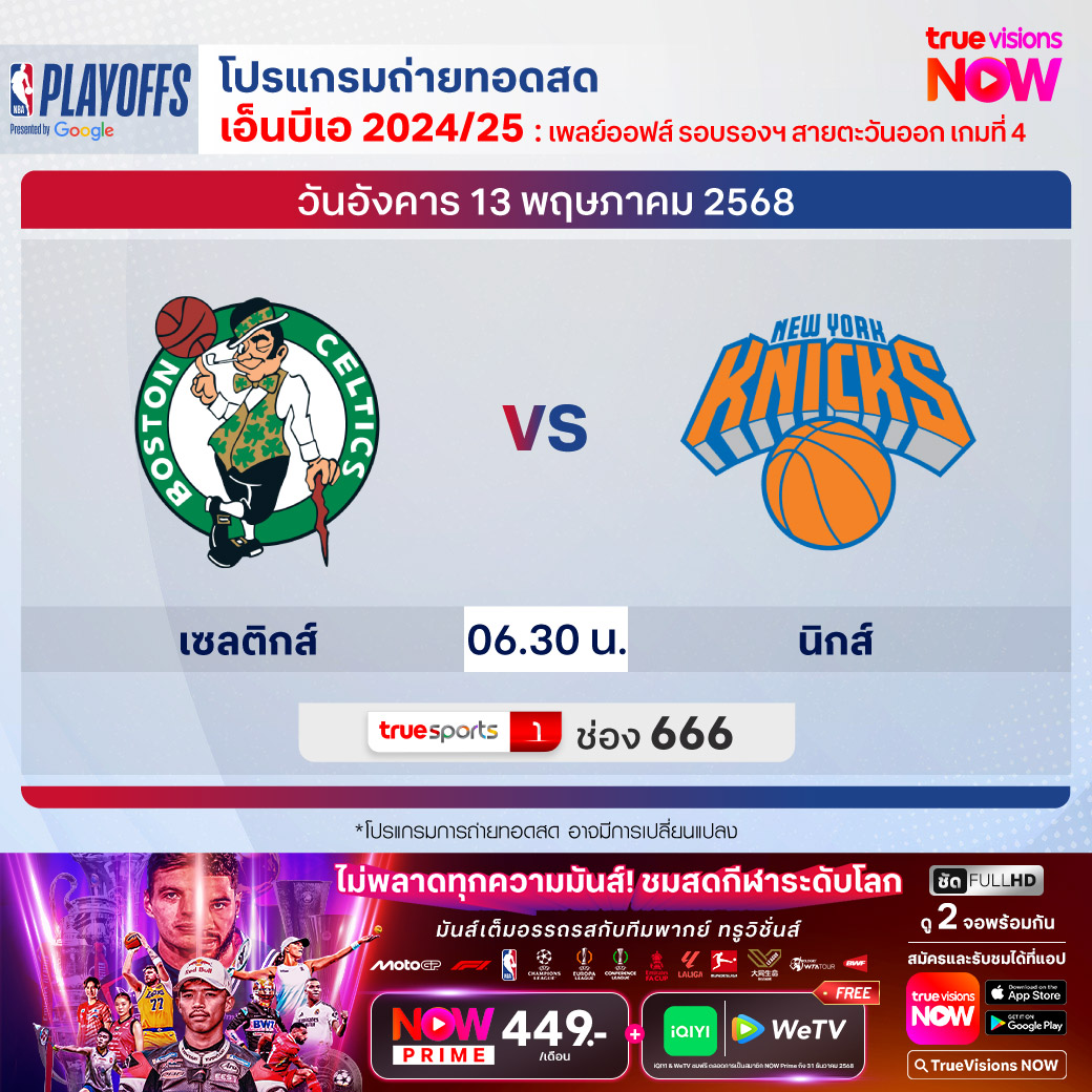 วันอังคาร 13 พ.ค. Celtics Vs Knicks เวลา 06.30 ทางช่อง TS 1 (666)