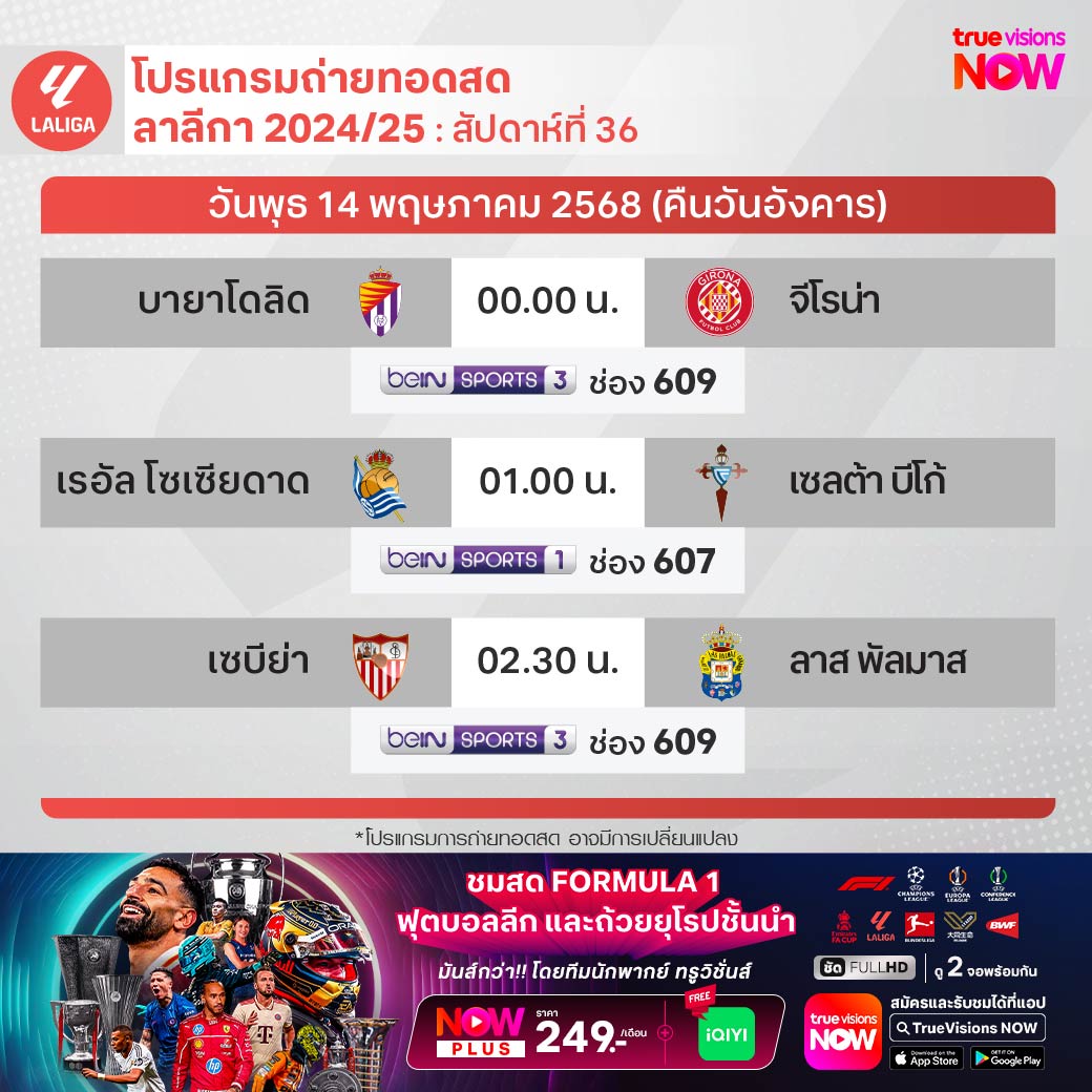 วันนี้มีอะไรดูที่ ทรูวิชั่นส์ ประจำวันอังคารที่ 13 พฤษภาคม 68 ยังคงมีกีฬาที่น่าสนใจให้ได้ตามลุ้นตามเชียร์กันเหมือนเดิม โดยในส่วนของฟุตบอลนั้นยังมีศึก ลา ลีกา สเปน ให้ได้ตามเชียร์กันต่อ ส่วนกีฬาอื่นๆ ยังมีเทนนิส เอทีพี ทัวร์ และ ดับเบิ้ลยูทีเอ ทัวร์ รายการ อิตาเลียน โอเพ่น งานนี้ ทรูวิชั่นส์ จัดเต็มให้ชมกันถึงบ้าน