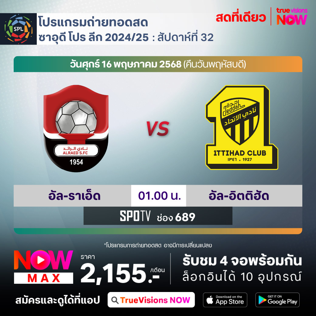 Al-Raed vs Al-Ittihad เวลา 01.00-03.00 ทางช่อง SPOTV (689)