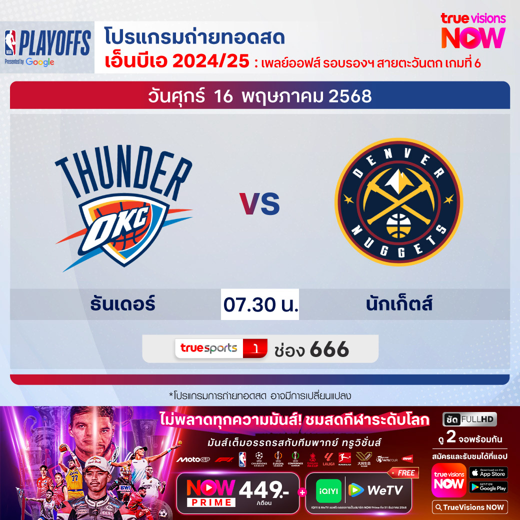 วันศุกร์ 16 พ.ค. Thunder Vs Nuggets เวลา 07.30 ทางช่อง TS 1 (666)