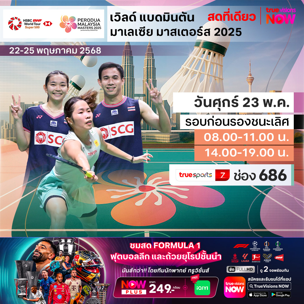 เวิลด์ แบดมินตัน เก็บคะแนนสะสมโลก มุ่งหน้าลงใต้สู่แดนเสือเหลือง กับการแช่งขัน รายการ มาเลเซีย มาสเตอร์ส 2025 ทัวร์นาเมนต์ระดับ เวิลด์ ทัวร์ ซูเปอร์ 500 ที่สนาม สเตเดี้ยม เอเชียต้า อารีน่า ในกรุงกัวลาลัมเปอร์ ประเทศมาเลเซีย ร่วมเชียร์นักแบดมินตันไทยคว้าชัยเพื่อเข้ารอบไปลุ้นตำแหน่งแชมป์กับมือระดับโลก ชมสด เอ็กซ์คลูซีฟ ที่เดียวที่ ทรูวิชั่นส์