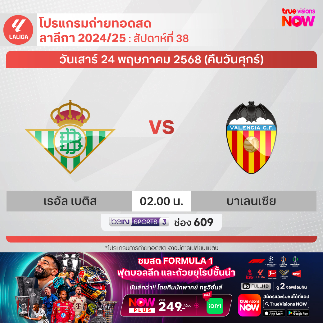 Real Betis vs Valencia เวลา 02.00-04.00 ทางช่อง beIN 3 (609)