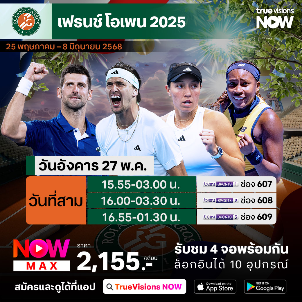 วันนี้มีอะไรดูที่ ทรูวิชั่นส์ ประจำวันอังคารที่ 27 พฤษภาคม 68 ยังคงมีกีฬาที่น่าสนใจให้ได้ตามลุ้นตามเชียร์กันเหมือนเดิม โดยในส่วนของเทนนิสนั้นเป็นรายการใหญ่ระดับแกรนด์สแลม รายการ เฟร้นช์ โอเพ่น และ บาสเกตบอลเอ็นบีเอ รอบเพลย์ออฟ งานนี้ ทรูวิชั่นส์ จัดเต็มให้ชมกันถึงบ้าน