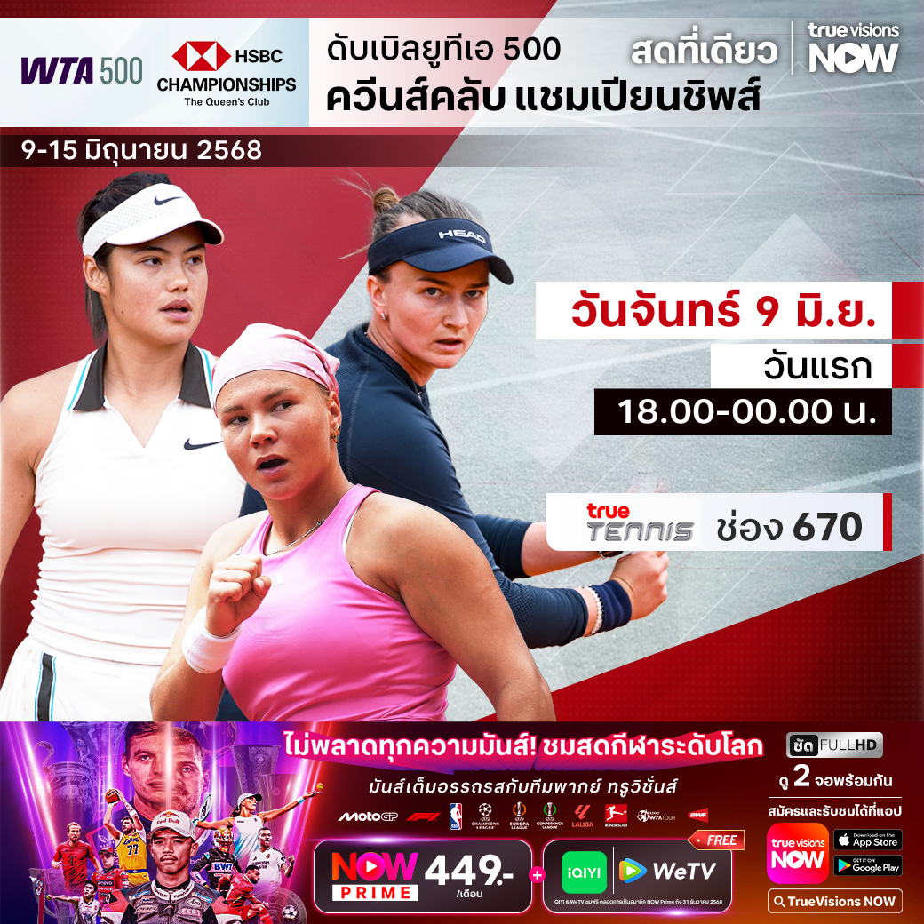 เทนนิสหญิง ดับเบิ้ลยูทีเอ ทัวร์ เข้าสู่ฤดูกาลการแข่งขันบนคอร์ทหญ้า เพื่อเตรียมพร้อมกับการสู้ศึกแกรนด์สแลม วิมเบิลดัน ต่อไป โดยสัปดาห์นี้พบกับรายการ เดอะ ควีนส์ คลับ แชมเปี้ยนชิพ แข่งขันที่ ควีนส์ คลับ สนามที่เก่าแก่และมีตำนานมาอย่างยาวนาน ในกรุงลอนดอน ประเทศอังกฤษ ร่วมลุ้นกันว่าใครจะคว้าแชมป์ปีนี้ไปครอง ชมสด ครบทุกรอบ ที่ ทรูวิชั่นส์