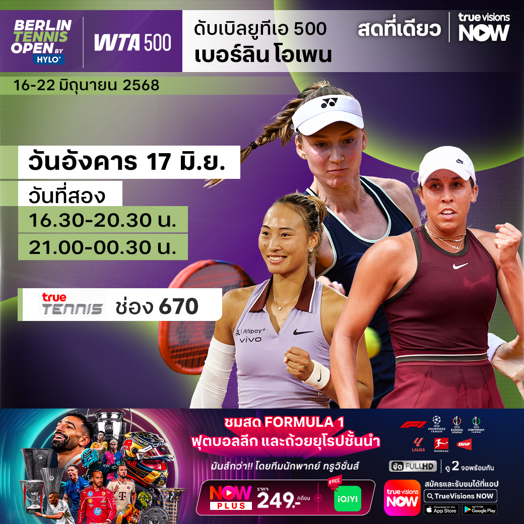 เทนนิสหญิง ดับเบิ้ลยูทีเอ ทัวร์ เข้าสู่ช่วงเข้มข้นก่อนจะถึงแกรนด์สแลมที่ 3 ของปี ลุ้นต่อเนื่องกับเทนนิสหญิงรายการคอร์ทหญ้า รายการใหญ่รายการที่ 2 กับรายการ เบอร์ลิน โอเพ่น ที่กรุงเบอร์ลิน ประเทศเยอรมนี ร่วมด้วยนักเทนนิสหญิงระดับโลกเข้าแข่งขันแบบจัดเต็ม นำโดย อารีนา ซาบาเลนก้า นักเทนนิสมือวางอันดับ 1 ของโลก ร่วมลุ้นว่าใครจะคว้าแชมป์ไปครอง ชมสด ครบทุกรอบ ที่ ทรูวิชั่นส์