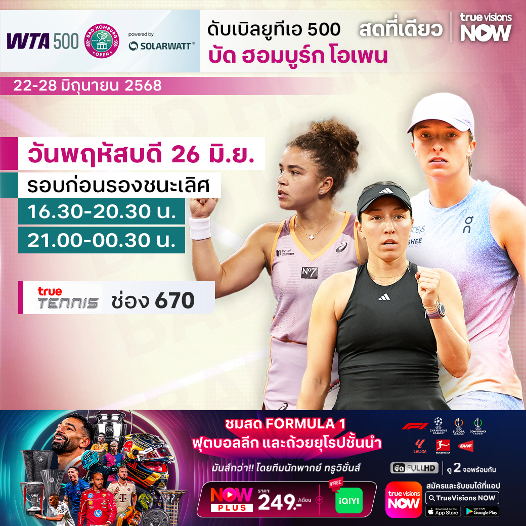 ต่อเนื่องกันเลยกับ เทนนิสหญิง ดับเบิ้ลยูทีเอ ทัวร์ รายการใหญ่ เพื่อเตรียมตัวก่อนเข้าสู่แกรนด์สแลมที่ 3 ของปีอย่างวิมเบิลดัน กับรายการ บัด ฮอมบูร์ก โอเพ่น ประเทศเยอรมนี บรรดามือดีของทัวร์ต่างลงแข่งกันอย่างพร้อมหน้า ร่วมลุ้นกันว่า ใครจะคว้าแชมป์รายการนี้ไปครอง ชมสด ครบทุกรอบ ที่ ทรูวิชั่นส์