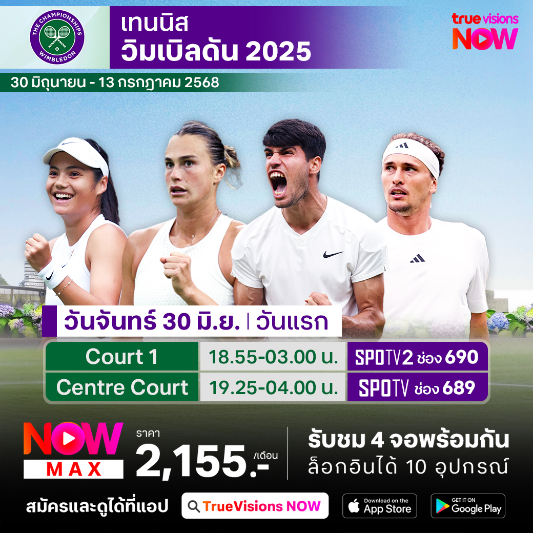 สิ้นสุดการรอคอย กับศึกเทนนิส แกรนด์สแลม วิมเบิลดัน เทนนิสรายการแกรนด์สแลมที่เก่าแก่และมีมนต์ขลังมากที่สุดในโลก และเป็นการแข่งขันบนคอร์ทหญ้า ที่มีรูปแบบการเล่นที่แตกต่างและมีเอกลักษณ์ สุดยอดนักเทนนิสระดับโลกร่วมเข้าแข่งขันกันคับคั่ง เพื่อร่วมชิงชัยและคว้าแชมป์รายการที่ยิ่งใหญ่นี้ ร่วมลุ้นว่าใครจะคว้าแชมป์ชายเดี่ยวและหญิงเดี่ยวไปครอง ชมสด เอ็กซ์คลูซีฟ ที่เดียวที่ ทรูวิชั่นส์