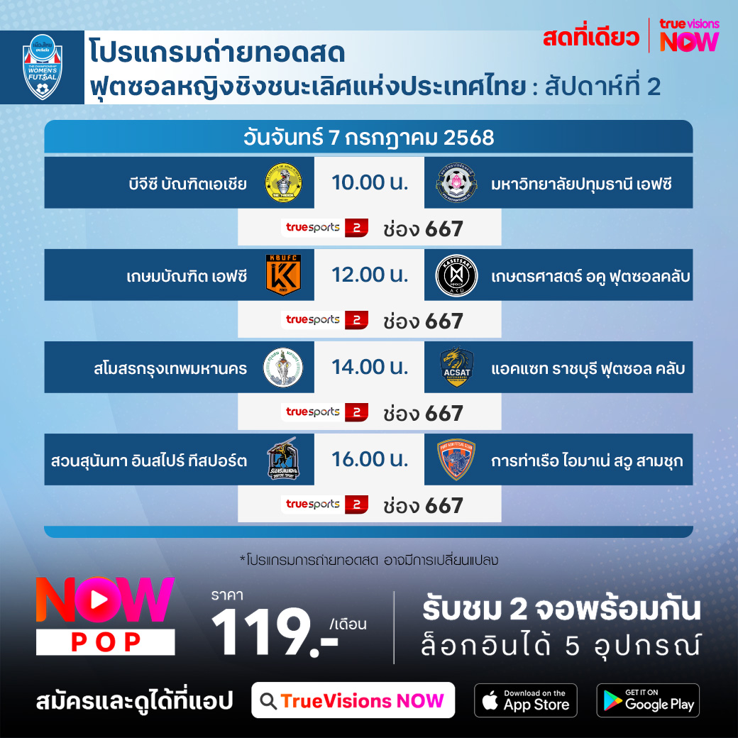 บีจีซี บัณฑิตเอเชีย พบ มหาวิทยาลัยปทุมธานี เอฟซี เวลา 10:00 ทางช่อง TS 2 (667)