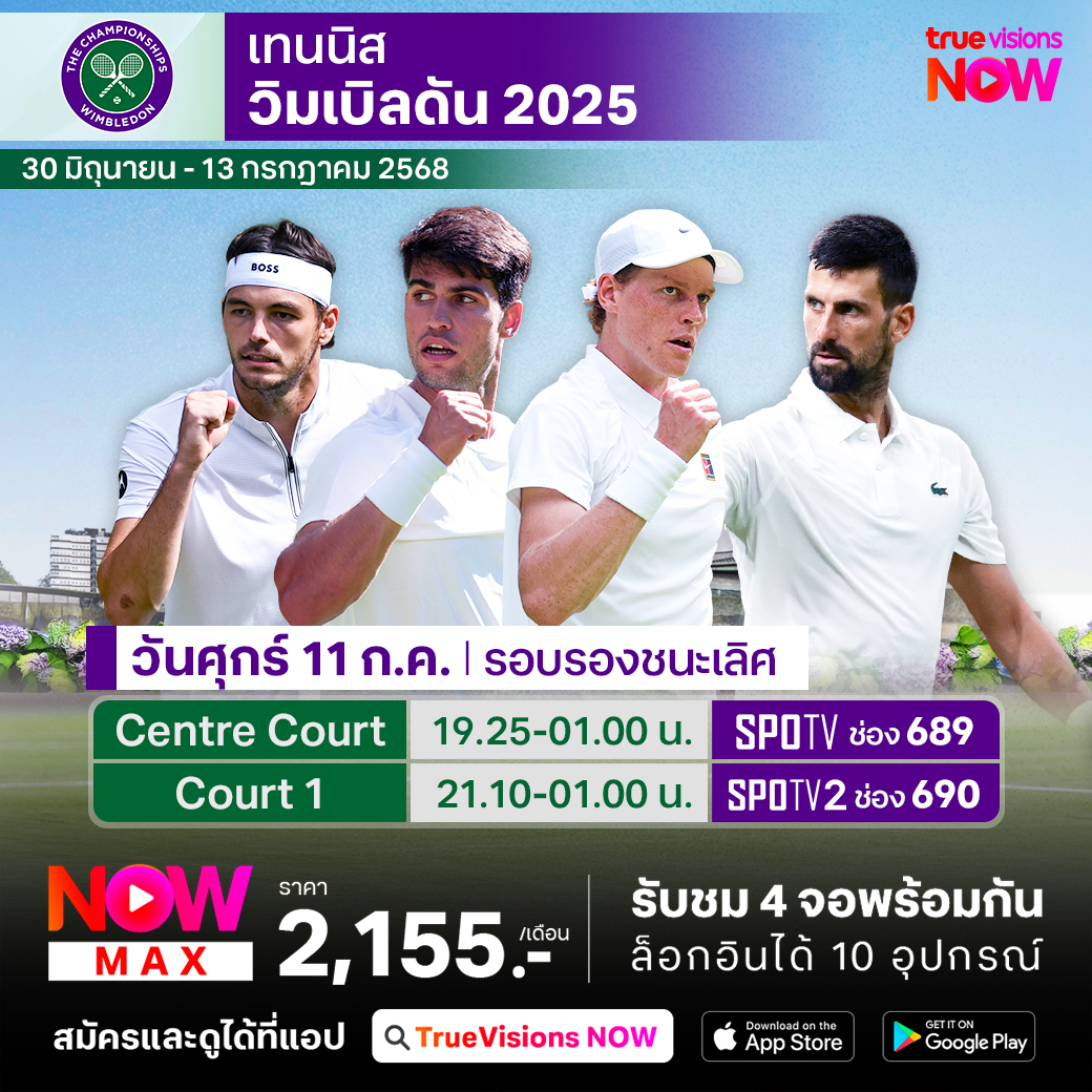 ศึกเทนนิส แกรนด์สแลม วิมเบิลดัน เทนนิสรายการแกรนด์สแลมที่เก่าแก่และมีมนต์ขลังมากที่สุดในโลก และเป็นการแข่งขันบนคอร์ทหญ้า ที่มีรูปแบบการเล่นที่แตกต่างและมีเอกลักษณ์ สุดยอดนักเทนนิสระดับโลกร่วมเข้าแข่งขันกันคับคั่ง เพื่อร่วมชิงชัยและคว้าแชมป์รายการที่ยิ่งใหญ่นี้ ร่วมลุ้นว่าใครจะคว้าแชมป์ชายเดี่ยวและหญิงเดี่ยวไปครอง ชมสด เอ็กซ์คลูซีฟ ที่เดียวที่ ทรูวิชั่นส์