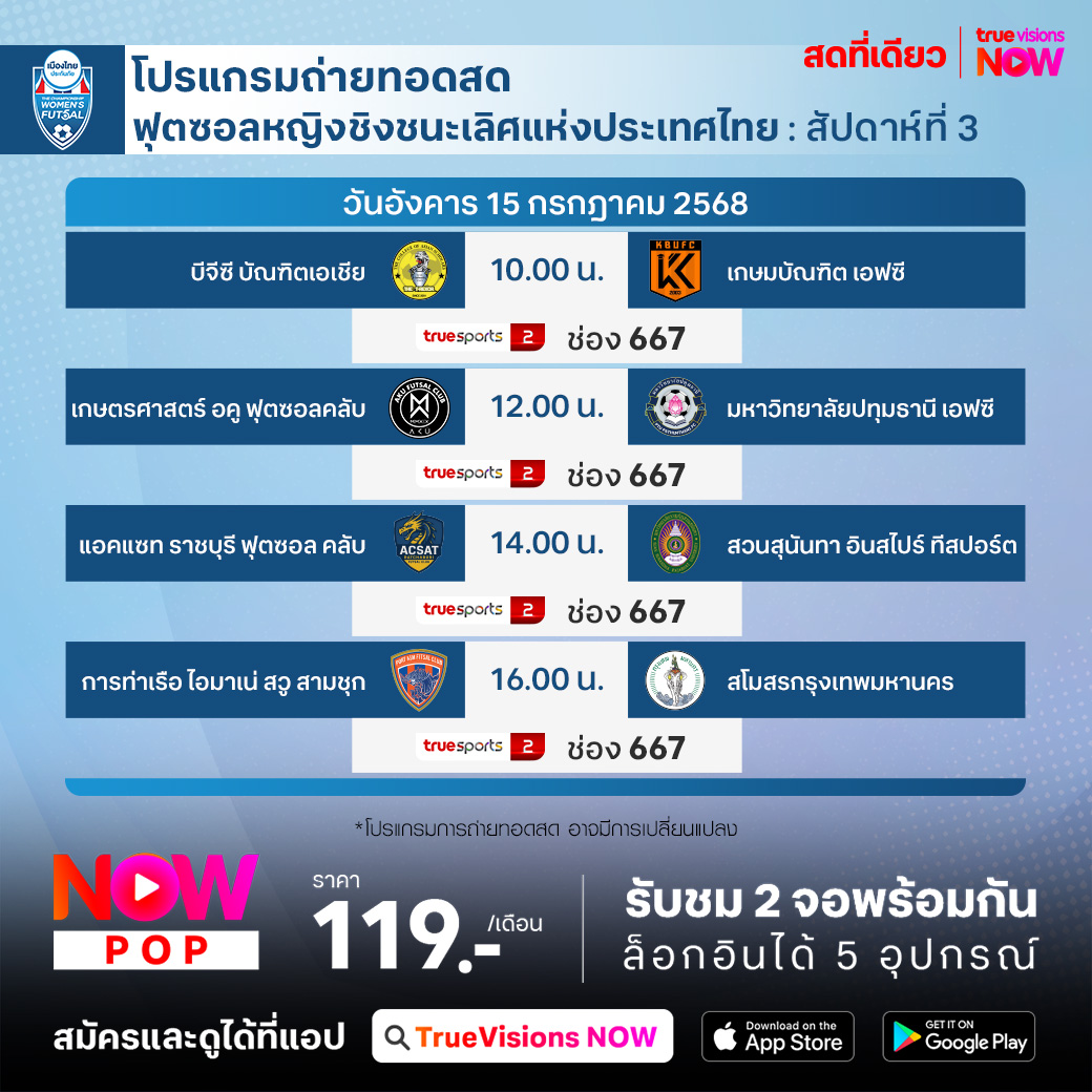 เกษตรศาสตร์ อคู ฟุตซอลคลับ พบ มหาวิทยาลัยปทุมธานี เอฟซี เวลา 12:00 ทางช่อง TS 2 (667)