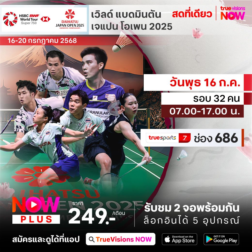 เวิลด์ แบดมินตัน รายการเก็บคะแนนสะสมโลก ระดับ เวิลด์ ทัวร์ ซูเปอร์ 750 กลับมาสร้างความมันส์ดุเดือดในเอเชียอีกครั้ง กับ รายการที่แฟนๆ รอคอย เจแปน โอเพ่น 2025 ที่มหานครโตเกียว ประเทศญี่ปุ่น ร่วมส่งใจเชียร์ทีมแบดมินตันไทยสร้างชื่อให้กระฉ่อนโลก ชมสด เอ็กซ์คลูซีฟ ทุกรอบสำคัญ ที่เดียวที่ ทรูวิชั่นส์