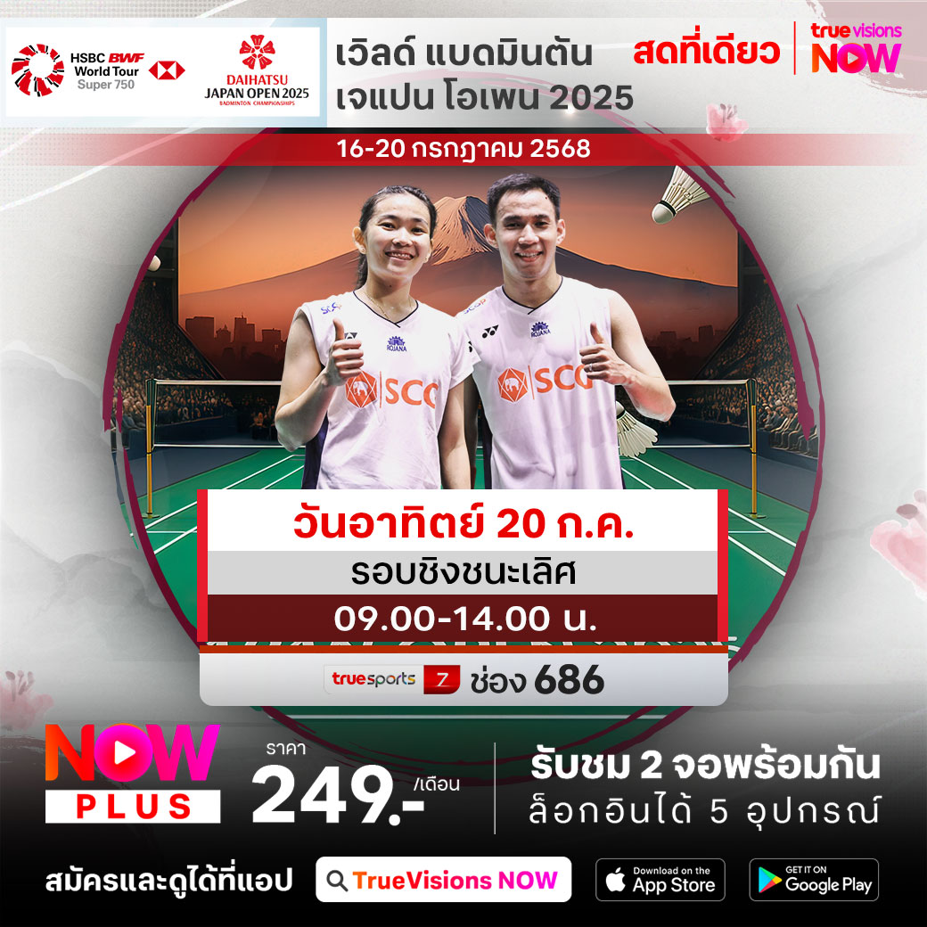 เวิลด์ แบดมินตัน รายการเก็บคะแนนสะสมโลก ระดับ เวิลด์ ทัวร์ ซูเปอร์ 750 รายการ เจแปน โอเพ่น 2025 ที่มหานครโตเกียว ประเทศญี่ปุ่น ร่วมส่งใจเชียร์ทีมแบดมินตันไทยคู่ผสม "บาส" เดชาพล พัววรานุเคราะห์ กับ "เฟม" ศุภิสรา เพียวสามพราน คว้าแชมป์ในรายการนี้ให้ได้ ชมสด เอ็กซ์คลูซีฟ ที่เดียวที่ ทรูวิชั่นส์