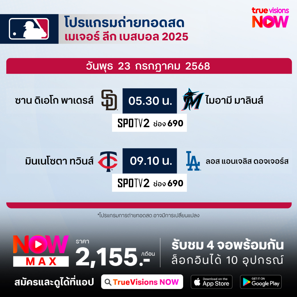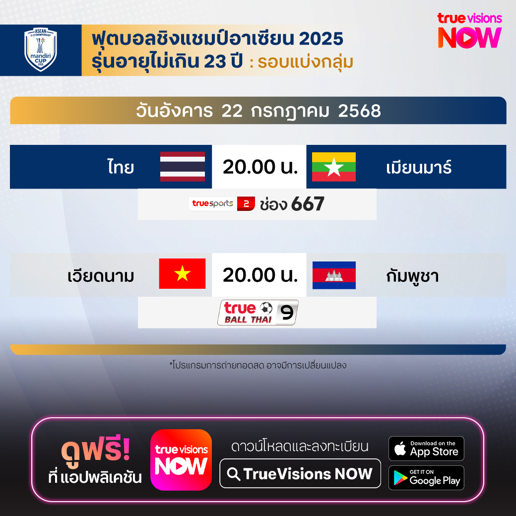 วันนี้มีอะไรดูที่ ทรูวิชั่นส์ ประจำวันอังคารที่ 22 กรกฎาคม 68 ยังคงมีกีฬาที่น่าสนใจให้ได้ตามลุ้นตามเชียร์กันเหมือนเดิม โดยในส่วนเทนนิสนั้น ยังมีเทนนิส เอทีพี ทัวร์ และ ดับเบิ้ลยูทีเอ ทัวร์ รายการ วอชิงตัน ดีซี โอเพ่น ส่วนกีฬาอื่นๆ ยังมี แบดมินตัน บีดับเบิ้่ลยูเอฟ รายการ ไชน่า โอเพ่น และ แบดมินตัน เอเชีย จูเนียร์ แชมเปี้ยนชิพ, เมเจอร์ ลีก เบสบอล และ ฟุตบอลชิงแชมป์อาเซียน 2025 รุ่นอายุไม่เกิน 23 ปี งานนี้ ทรูวิชั่นส์ จัดเต็มให้ชมกันถึงบ้าน