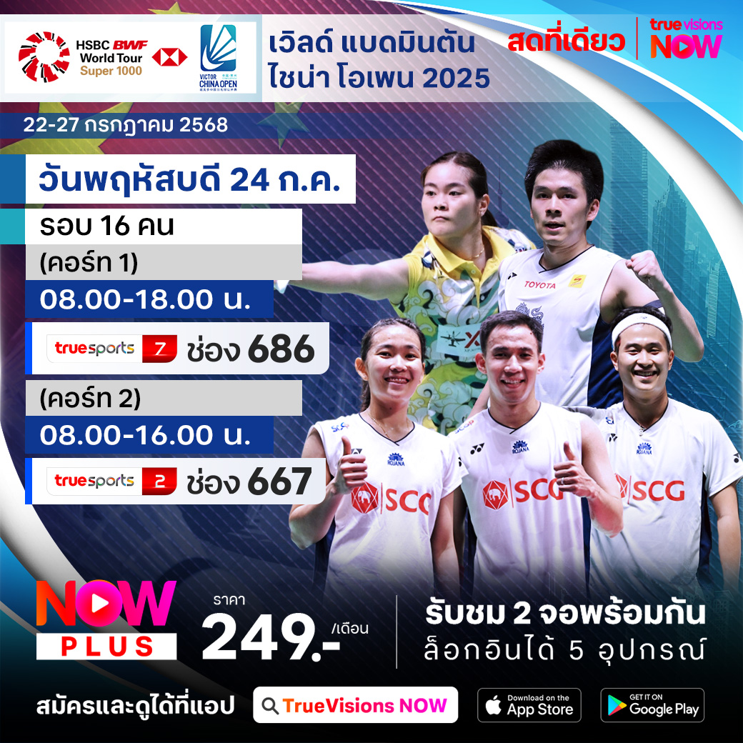 แบดมินตัน บีดับเบิ้ลยูเอฟ เก็บคะแนนสะสมโลก สัปดาห์นี้พบกับรายการสุดยิ่งใหญ่ ระดับ เวิลด์ ทัวร์ ซูเปอร์ 1000 ไชน่า โอเพ่น ที่เมืองฉางโจว ประเทศจีน จัดเต็มทั้งเงินรางวัลมหาศาล 64.5 ล้านบาท รวมถึงบรรดาซูเปอร์สตาร์ตัวท็อปของจีนและมือระดับโลกจากทุกชาติชั้นนำมาประชันฝีมือกัน ร่วมส่งใจเชียร์ทีมแบดมินตันไทยให้คว้าชัยเหนือคู่แข่งเพื่อเป็นแชมป์ ชมสด เอ็กซ์คลูซีฟ ครบทุกรอบ ที่เดียวที่ ทรูวิชั่นส์
