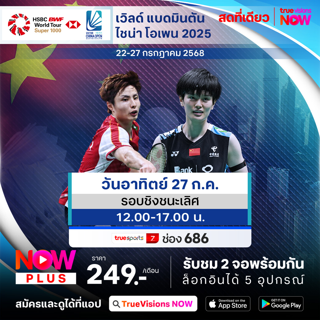 แบดมินตัน บีดับเบิ้ลยูเอฟ เก็บคะแนนสะสมโลก สัปดาห์นี้พบกับรายการสุดยิ่งใหญ่ ระดับ เวิลด์ ทัวร์ ซูเปอร์ 1000 ไชน่า โอเพ่น ที่เมืองฉางโจว ประเทศจีน จัดเต็มทั้งเงินรางวัลมหาศาล 64.5 ล้านบาท รวมถึงบรรดาซูเปอร์สตาร์ตัวท็อปของจีนและมือระดับโลกจากทุกชาติชั้นนำมาประชันฝีมือกัน ชมสด เอ็กซ์คลูซีฟ ครบทุกรอบ ที่เดียวที่ ทรูวิชั่นส์