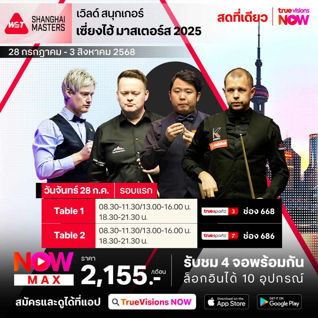 เปิดฤดูกาลใหม่ 2025/26 อย่างเป็นทางการแล้ว สำหรับ เวิลด์ สนุกเกอร์ ทัวร์ แฟนๆ กีฬาสอยคิวจะได้สัมผัสเกมที่สนุก ตื่นเต้น และเร้าใจ กับการออกคิวของสุดยอดมือระดับโลกที่มาลุ้นแชมป์กันอย่างคับคั่ง เปิดหัวกันด้วยรายการ เซี่ยงไฮ้ มาสเตอร์ส 2025 จากนครเซี่ยงไฮ้ ประเทศจีน ปีนี้เจ้าภาพระดมเอามือดีที่สุดที่แฟนๆ ชื่นชอบมาวัดฝีมือกัน ทั้งแชมป์โลกและมือท็อปของ เวิลด์ แรงกิ้ง ชมสด เอ็กซ์คลูซีฟ ครบทุกเฟรม ทุกรอบ ที่เดียวที่ ทรูวิชั่นส์