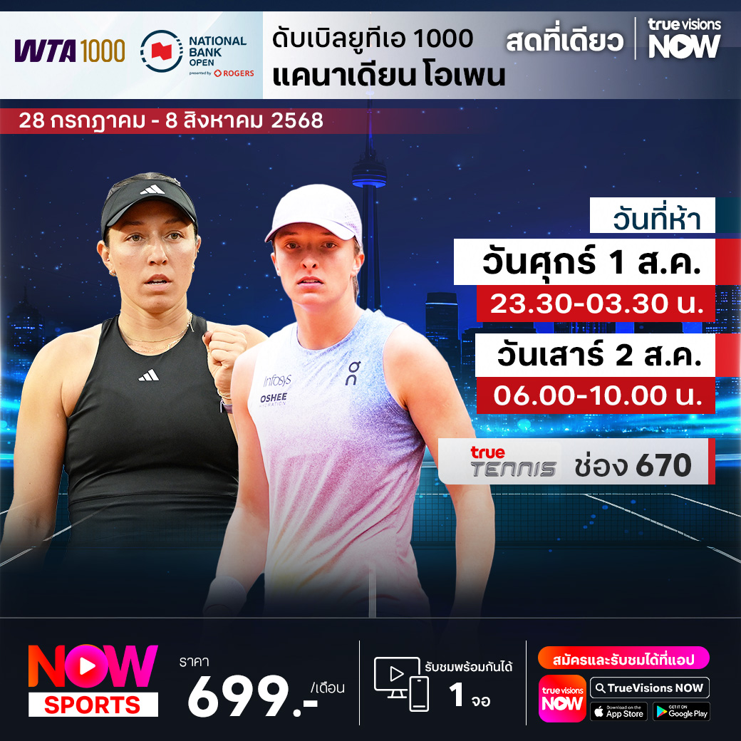 เทนนิสหญิง ดับเบิ้ลยูทีเอ ทัวร์ สัปดาห์นี้พบกับรายการระดับ WTA 1000 แคนาเดี้ยน โอเพ่น ที่ประเทศแคนาดา รายการนี้บรรดามือระดับโลกเข้าร่วมชิงชัยกันคับคั่ง เพื่อเตรียมความพร้อมก่อนเข้าสู่การแข่งขันแกรนด์สแลมสุดท้ายของปี ร่วมลุ้นกันว่าใครจะคว้าแชมป์ไปครอง ชมสด ครบทุกรอบ ที่ ทรูวิชั่นส์