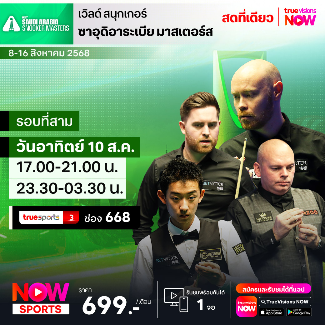 กลับมาอีกครั้งกับความยิ่งใหญ่ระดับ บิ๊ก อีเวนท์ ของ เวิลด์ สนุกเกอร์ ทัวร์ เก็บคะแนนสะสมโลก สัปดาห์นี้ พาแฟนๆ ไปสัมผัสความอลังการของ ซาอุดิอาระเบีย สนุกเกอร์ มาสเตอร์ส ที่ระดมเอามือดีระดับซูเปอร์สตาร์มาชิงแชมป์และเงินรางวัลรวมระดับมหาศาล จาก ไอคอนนิก กรีน ฮอลล์ เมืองเจดดาห์ ซาอุดิอาระเบีย ชมสด ครบทุกรอบ แบบเอ็กซ์คลูซีฟ ที่เดียวที่ ทรูวิชั่นส์