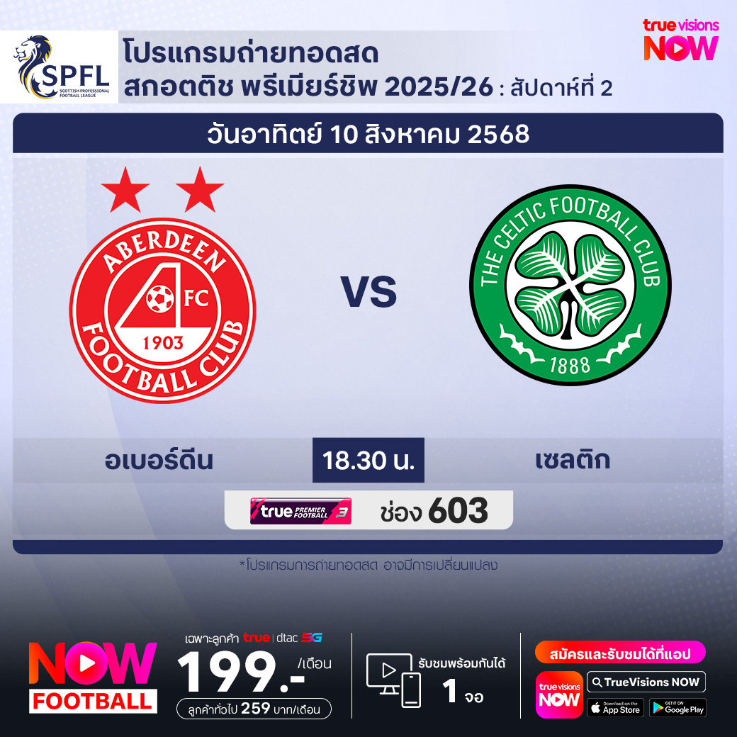 Aberdeen vs Celtic เวลา 18.30-20.30 ทางช่อง TPF 3 (603)