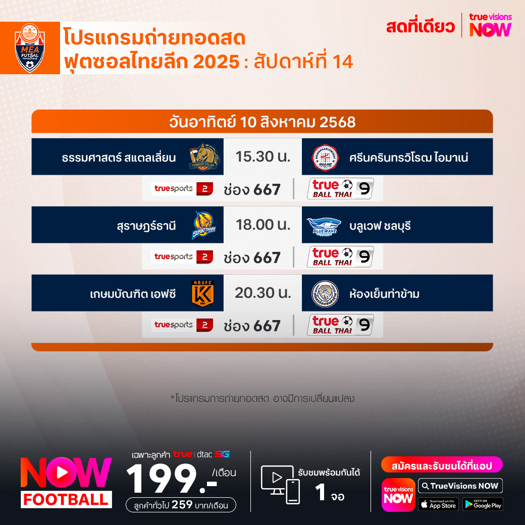 วันนี้มีอะไรดูที่ ทรูวิชั่นส์ ประจำวันอาทิตย์ที่ 10 สิงหาคม 68 ยังคงมีกีฬาที่น่าสนใจให้ได้ตามลุ้นตามเชียร์กันเหมือนเดิม โดยในส่วนของฟุตบอลนั้น ยังมีศึก สกอตติช พรีเมียร์ชิพ, เมเจอร์ ลีก ซอคเก้อร์, ฟุตบอลหญิงชิงแชมป์อาเซียน 2025 และศึกฟุตซอลไทยลีก ให้ได้ตามเชียร์กันต่อ ส่วนกีฬาอื่นๆ ยังมีเทนนิส เอทีพี ทัวร์ และ ดับเบิ้ลยูทีเอ ทัวร์ รายการ ซินซินแนติ โอเพ่น, กอล์ฟ พีจีเอ ทัวร์ รายการ เฟดเอ็กซ์ เซนต์ จู๊ด แชมเปี้ยนชิพ, กอล์ฟ ดีพี เวิลด์ ทัวร์ รายการ เน็กโซ่ แชมเปี้ยนชิพ, เวิลด์ สนุกเกอร์ ทัวร์ รายการ ซาอุดิอาระเบีย สนุกเกอร์ มาสเตอร์ส และ เมเจอร์ ลีก เบสบอล งานนี้ ทรูวิชั่นส์ จัดเต็มให้ชมกันถึงบ้าน