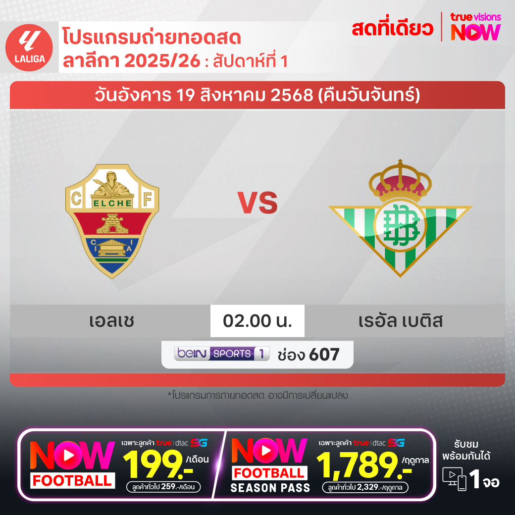 Elche vs Real Betis เวลา 02.00-04.00 ทางช่อง beIN 1 (607)