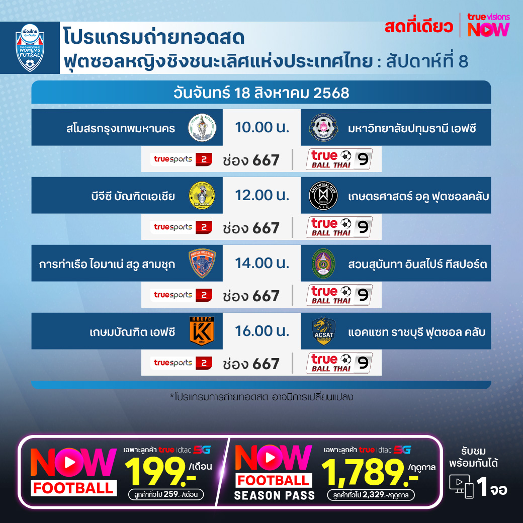 บีจีซี บัณฑิตเอเชีย พบ เกษตรศาสตร์ อคู ฟุตซอลคลับ เวลา 12:00 ทางช่อง TS 2 (667) / True Ball Thai 9